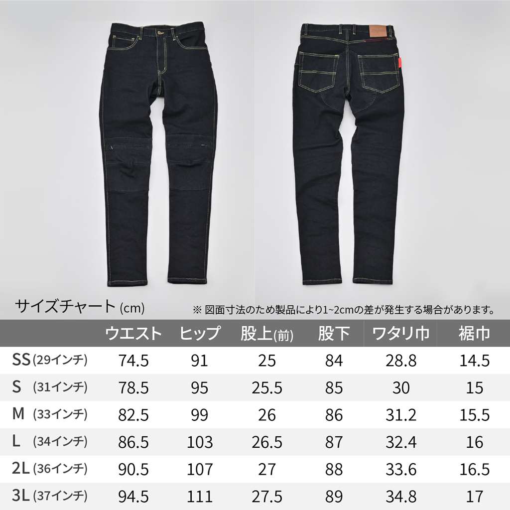 伸縮性に優れた13ozのストレッチ生地を採用し、動きやすさ快適さ重視のスリムフィットジーンズ。膝プロテクターポケットは外側に設置し、足の入れやすさ、履きやすさとプロテクターの外しやすさを重視。股下はバイクにまたがりやすくライディング姿勢にフィットする形状かつ、直立時も綺麗に見えるシルエットに仕上げました。ひざのプロテクターは、SAS-TECのTRIPLEFLEXタイプを標準装備。CE規格をクリアした安全性と、体にフィットする装着感の良いプロテクターが付属。シーズン:春夏秋伸縮性に優れた13ozのストレッチ生地を採用し、動きやすさと快適さを重視バイクにまたがりやすくライディング姿勢にフィットする形状ひざプロテクター:SAS-TECのTRIPLEFLEXタイプを装備CE規格をクリアした安全性と、体にフィットする装着感の良いプロテクターが付属※図面寸法のため製品により1-2cmの差が発生する場合があります。