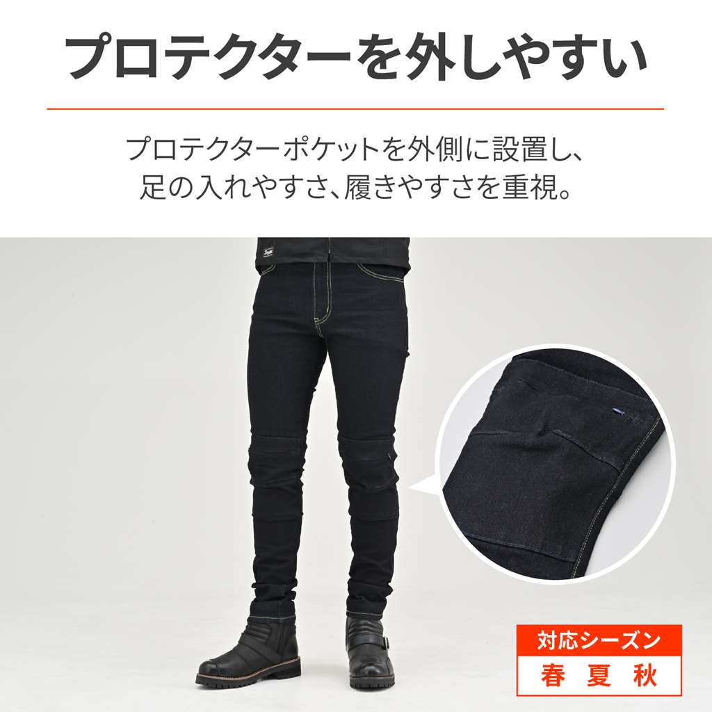 伸縮性に優れた13ozのストレッチ生地を採用し、動きやすさ快適さ重視のスリムフィットジーンズ。膝プロテクターポケットは外側に設置し、足の入れやすさ、履きやすさとプロテクターの外しやすさを重視。股下はバイクにまたがりやすくライディング姿勢にフィットする形状かつ、直立時も綺麗に見えるシルエットに仕上げました。ひざのプロテクターは、SAS-TECのTRIPLEFLEXタイプを標準装備。CE規格をクリアした安全性と、体にフィットする装着感の良いプロテクターが付属。シーズン:春夏秋伸縮性に優れた13ozのストレッチ生地を採用し、動きやすさと快適さを重視バイクにまたがりやすくライディング姿勢にフィットする形状ひざプロテクター:SAS-TECのTRIPLEFLEXタイプを装備CE規格をクリアした安全性と、体にフィットする装着感の良いプロテクターが付属※図面寸法のため製品により1-2cmの差が発生する場合があります。