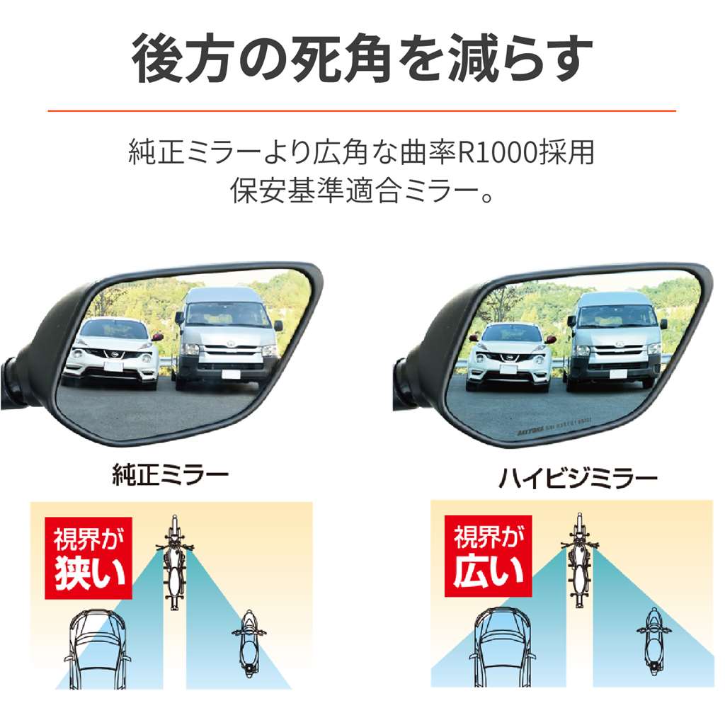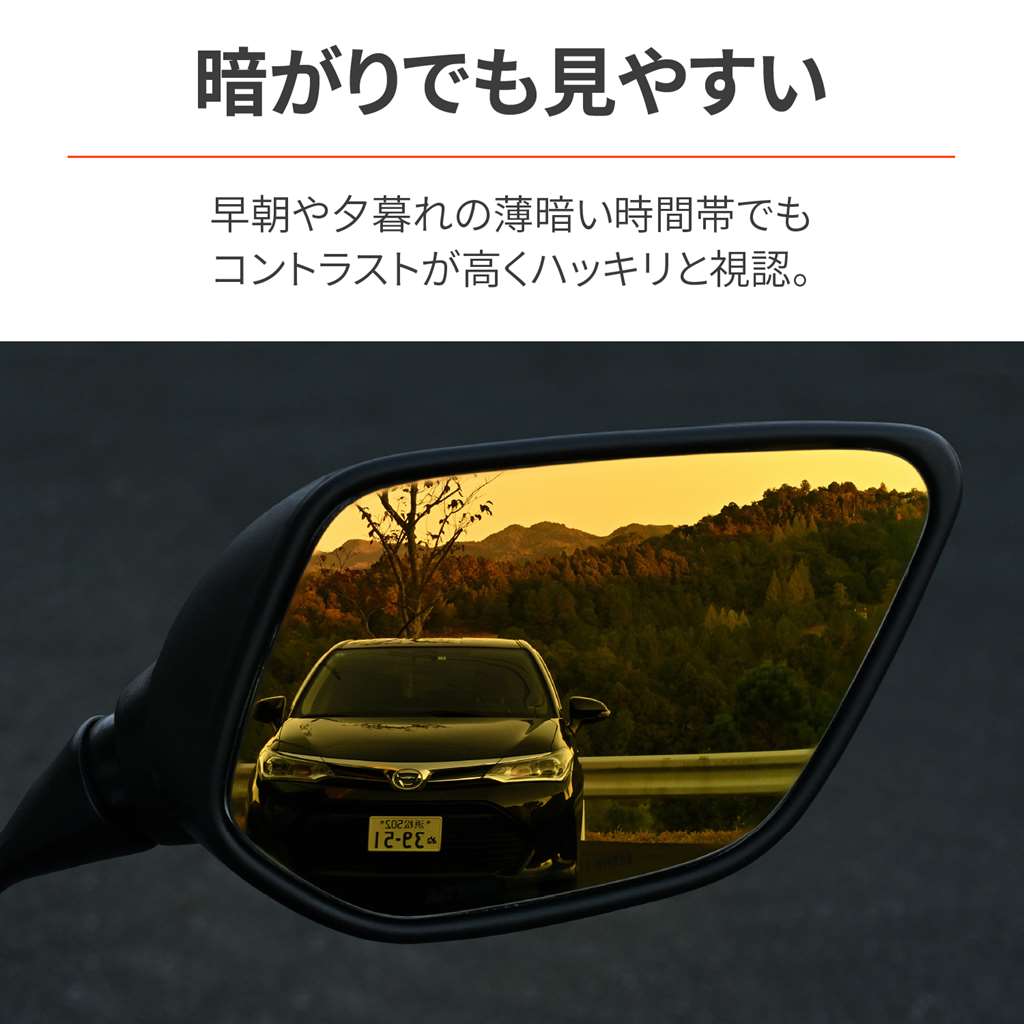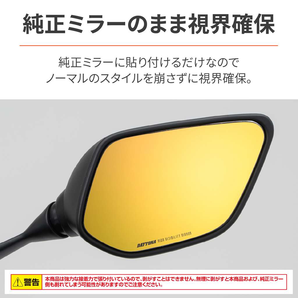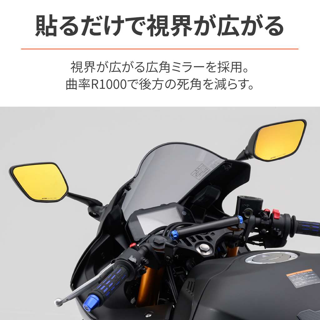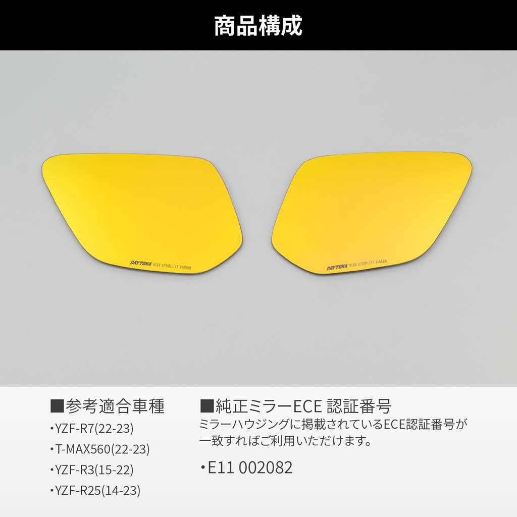 貼るだけで視界が広く、見やすいハイビジミラー。純正よりも視界が広がる曲率R1000の広角ミラーで後方の死角を減らします。早朝や夕暮れの薄暗い時間帯でもコントラストが高くはっきり見えるゴールドミラーを採用。純正ミラーに貼り付けるだけなので、ノーマルのスタイルを崩さずに視界を確保します。【参考適合車種】YZF-R7(22-23)T-MAX560(22-23)YZF-R3(15-22)YZF-R25(14-23)【純正ミラーECE 認証番号】E11 002082ミラーハウジングに掲載されているECE 認証番号が一致すれば、参考適合車種以外の車両にも取付が可能です。参考適合車種:YZF-R7(22-23)、T-MAX560(22-23)、YZF-R3(15-22)、YZF-R25(14-23)純正ミラーに貼り付けるだけで視界が広がる曲率R1000の広角ミラー早朝や夕暮れの薄暗い時間帯でもコントラストが高くはっきり見えるゴールドミラー純正ミラーECE 認証番号:E11 002082 に適合新保安基準適合※本商品は強力な接着力で張り付いているので、剥がすことはできません。無理に剥がすと本商品および、純正ミラー側も割れてしまう可能性がありますのでご注意ください。※本商品はガラス製品のためケガ、割れなどお取り扱いには充分ご注意ください。※気温の低いときの施工は両面テープの接着力が低下しますので、ドライヤーなどで軽く暖めて作業することをおすすめします。※テープの完全接着までは(約24時間程度かかります)水濡れや激しい振動を与えないようにしてください。※車体側ミラーの製造誤差により、本商品との形状にズレが生じることがあります。ズレが生じた場合黒色油性マジックで車体側ミラー枠に沿って塗るとすき間が目立たなくなります。※本商品が車体側にはまらない場合は、車体側ミラーの縁をドライヤーなどで暖めるとはまりやすくなります。※強力両面テープを使用しておりますので、貼り直しはできません。位置決めなど慎重に行なうようにしてください。無理に剥がそうとした際は、ミラーの破損、ケガの恐れがあります。絶対に行なわないでください。※本商品は、ワイドミラータイプとなっております。遠近感が純正ミラーと異なります。慣れるまで慎重に運転するように心がけてください。※ミラーの縁は滑らかになっておりますが手を切ったりしないよう充分ご注意ください。