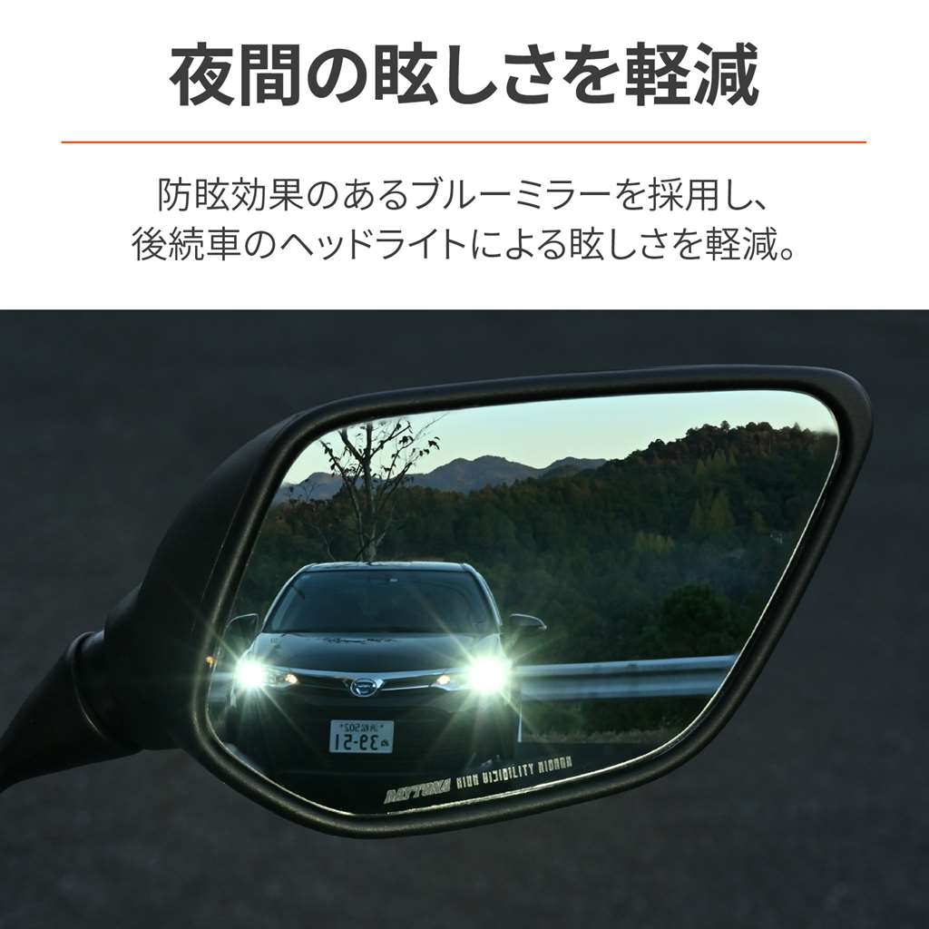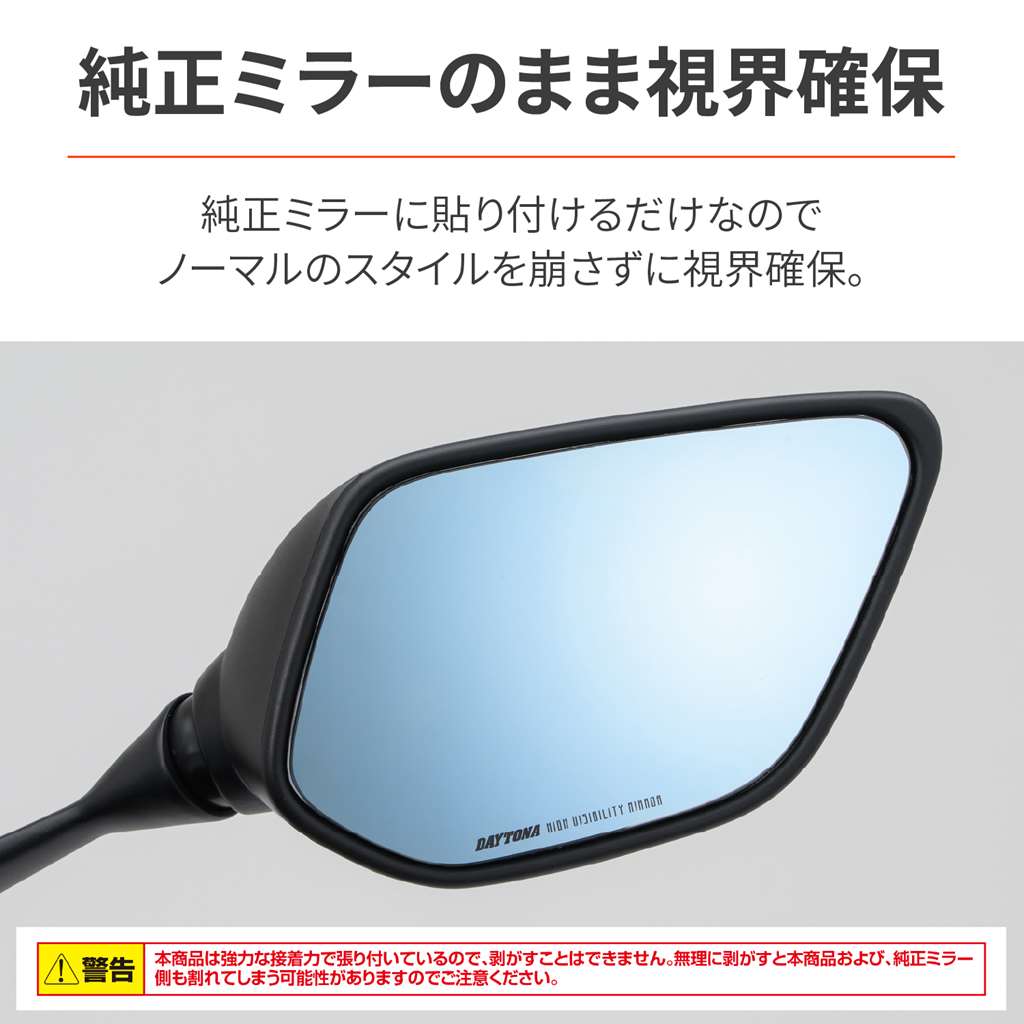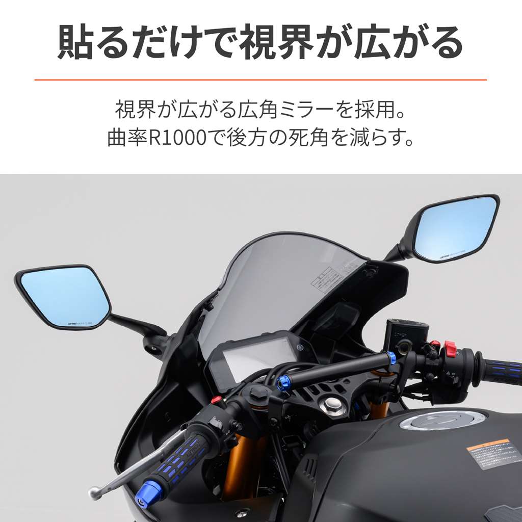 貼るだけで視界が広く、見やすいハイビジミラー。純正よりも視界が広がる曲率R1000の広角ミラーで後方の死角を減らします。防眩効果のあるブルーミラーを採用し、ヘッドライトによる眩しさを軽減。純正ミラーに貼り付けるだけなので、ノーマルのスタイルを崩さずに視界を確保します。【参考適合車種】YZF-R7(22-23)T-MAX560(22-23)YZF-R3(15-22)YZF-R25(14-23)【純正ミラーECE 認証番号】E11 002082ミラーハウジングに掲載されているECE 認証番号が一致すれば、参考適合車種以外の車両にも取付が可能です。参考適合車種:YZF-R7(22-23)、T-MAX560(22-23)、YZF-R3(15-22)、YZF-R25(14-23)純正ミラーに貼り付けるだけで視界が広がる曲率R1000の広角ミラー防眩効果のあるブルーミラーを採用し、ヘッドライトによる眩しさを軽減純正ミラーECE 認証番号:E11 002082 に適合新保安基準適合※本商品は強力な接着力で張り付いているので、剥がすことはできません。無理に剥がすと本商品および、純正ミラー側も割れてしまう可能性がありますのでご注意ください。※本商品はガラス製品のためケガ、割れなどお取り扱いには充分ご注意ください。※気温の低いときの施工は両面テープの接着力が低下しますので、ドライヤーなどで軽く暖めて作業することをおすすめします。※テープの完全接着までは(約24時間程度かかります)水濡れや激しい振動を与えないようにしてください。※車体側ミラーの製造誤差により、本商品との形状にズレが生じることがあります。ズレが生じた場合黒色油性マジックで車体側ミラー枠に沿って塗るとすき間が目立たなくなります。※本商品が車体側にはまらない場合は、車体側ミラーの縁をドライヤーなどで暖めるとはまりやすくなります。※強力両面テープを使用しておりますので、貼り直しはできません。位置決めなど慎重に行なうようにしてください。無理に剥がそうとした際は、ミラーの破損、ケガの恐れがあります。絶対に行なわないでください。※本商品は、ワイドミラータイプとなっております。遠近感が純正ミラーと異なります。慣れるまで慎重に運転するように心がけてください。※ミラーの縁は滑らかになっておりますが手を切ったりしないよう充分ご注意ください。