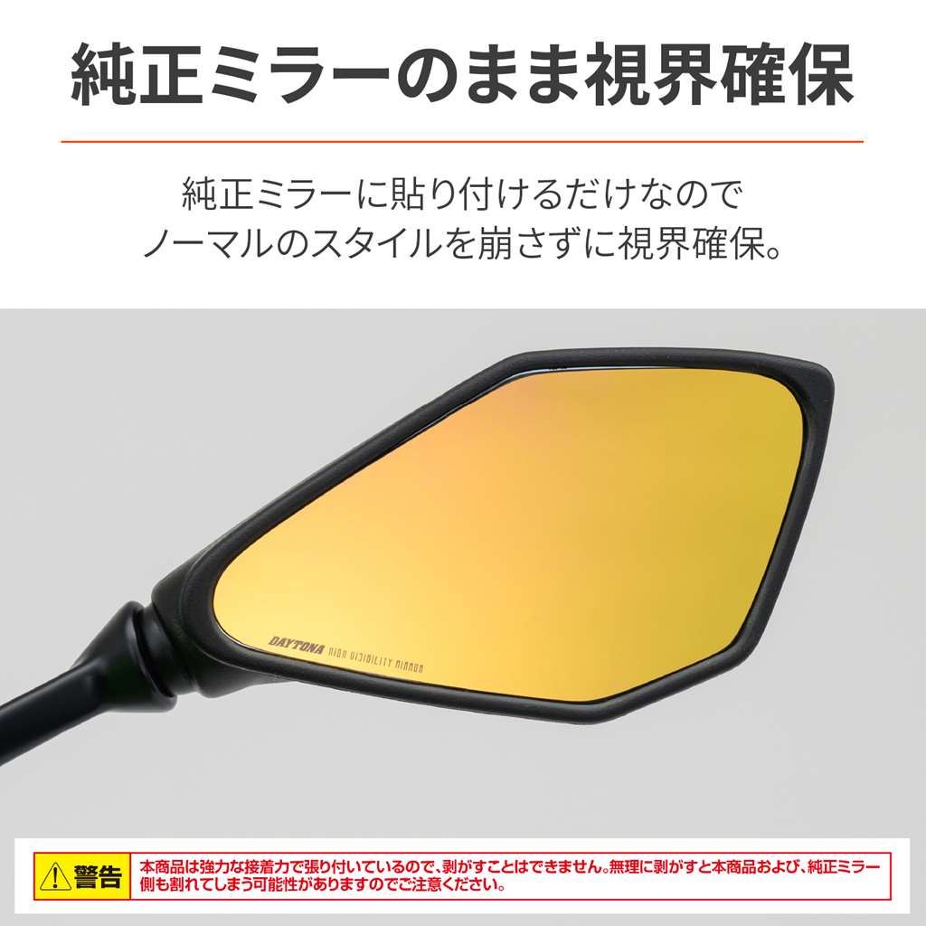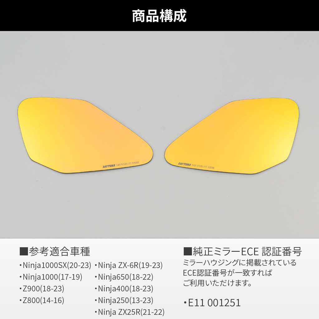 貼るだけで視界が広く、見やすいハイビジミラー。純正よりも視界が広がる曲率R1000の広角ミラーで後方の死角を減らします。早朝や夕暮れの薄暗い時間帯でもコントラストが高くはっきり見えるゴールドミラーを採用。純正ミラーに貼り付けるだけなので、ノーマルのスタイルを崩さずに視界を確保します。【参考適合車種】Ninja1000SX(20-23)Ninja1000(17-19)Z900(18-23)Z800(14-16)Ninja ZX-6R(19-23)Ninja650(18-22)Ninja400(18-23)Ninja250(13-23)Ninja ZX-25R(21-22)【純正ミラーECE 認証番号】E11 001251ミラーハウジングに掲載されているECE 認証番号が一致すれば、参考適合車種以外の車両にも取付が可能です。参考適合車種:Ninja1000SX(20-23)、Ninja1000(17-19)、Z900(18-23)、Z800(14-16)、Ninja ZX-6R(19-23)、Ninja650(18-22)、Ninja400(18-23)、Ninja250(13-23)、Ninja ZX-25R(21-22)純正ミラーに貼り付けるだけで視界が広がる曲率R1000の広角ミラー早朝や夕暮れの薄暗い時間帯でもコントラストが高くはっきり見えるゴールドミラー純正ミラーECE 認証番号:E11 001251 に適合新保安基準適合※本商品は強力な接着力で張り付いているので、剥がすことはできません。無理に剥がすと本商品および、純正ミラー側も割れてしまう可能性がありますのでご注意ください。※本商品はガラス製品のためケガ、割れなどお取り扱いには充分ご注意ください。※気温の低いときの施工は両面テープの接着力が低下しますので、ドライヤーなどで軽く暖めて作業することをおすすめします。※テープの完全接着までは(約24時間程度かかります)水濡れや激しい振動を与えないようにしてください。※車体側ミラーの製造誤差により、本商品との形状にズレが生じることがあります。ズレが生じた場合黒色油性マジックで車体側ミラー枠に沿って塗るとすき間が目立たなくなります。※本商品が車体側にはまらない場合は、車体側ミラーの縁をドライヤーなどで暖めるとはまりやすくなります。※強力両面テープを使用しておりますので、貼り直しはできません。位置決めなど慎重に行なうようにしてください。無理に剥がそうとした際は、ミラーの破損、ケガの恐れがあります。絶対に行なわないでください。※本商品は、ワイドミラータイプとなっております。遠近感が純正ミラーと異なります。慣れるまで慎重に運転するように心がけてください。※ミラーの縁は滑らかになっておりますが手を切ったりしないよう充分ご注意ください。