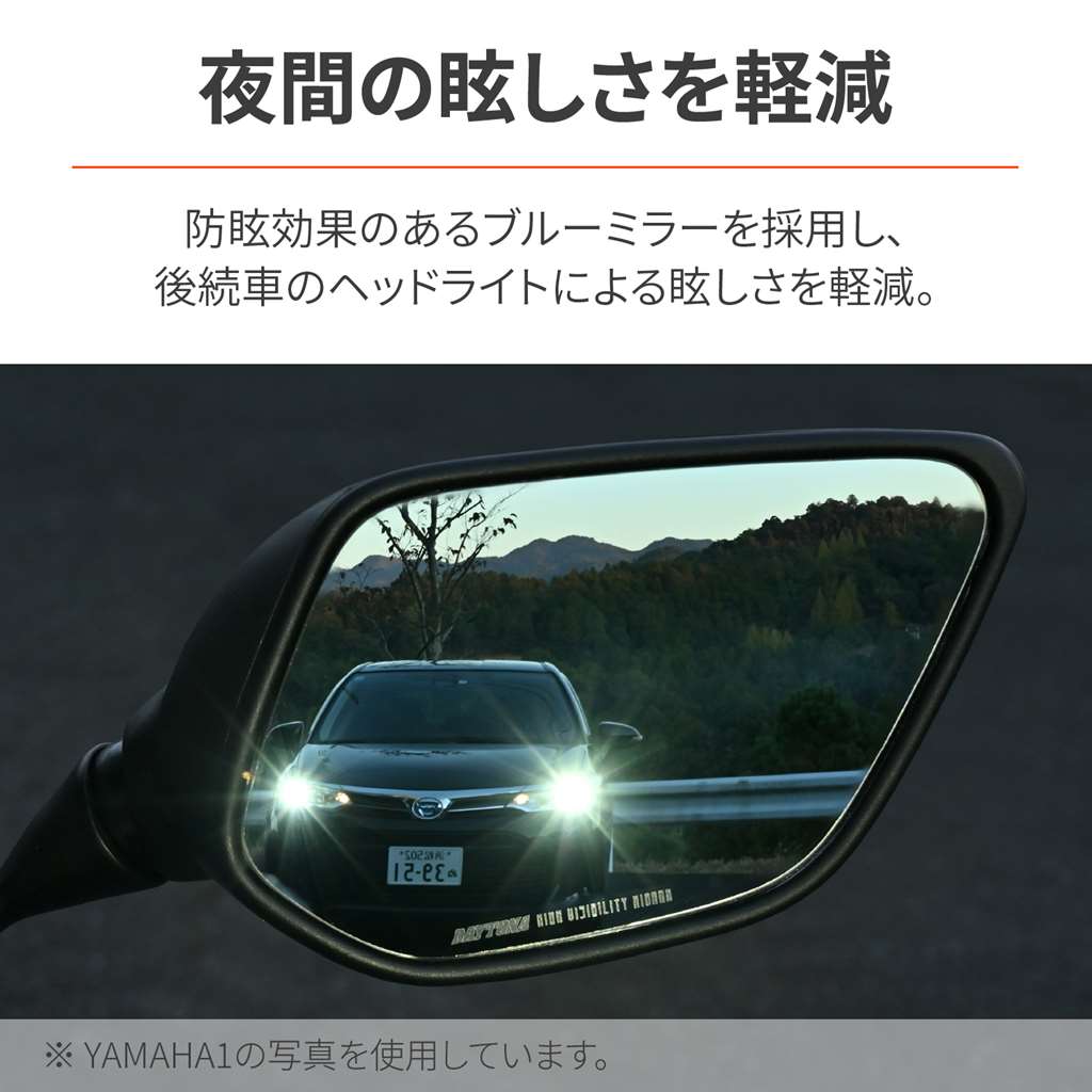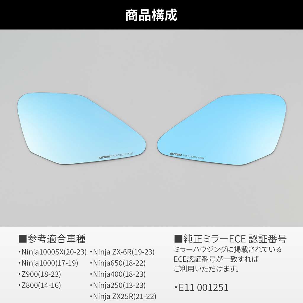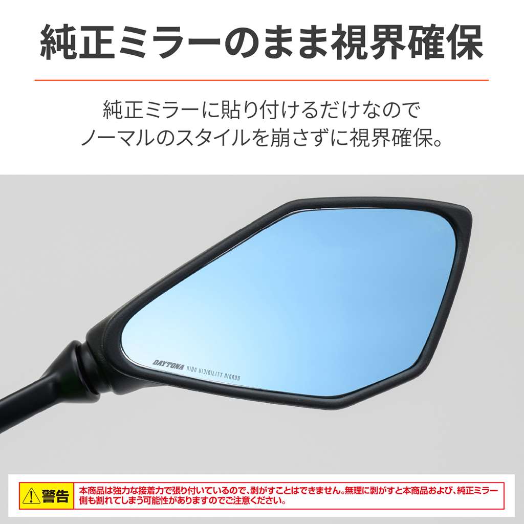 貼るだけで視界が広く、見やすいハイビジミラー。純正よりも視界が広がる曲率R1000の広角ミラーで後方の死角を減らします。防眩効果のあるブルーミラーを採用し、ヘッドライトによる眩しさを軽減。純正ミラーに貼り付けるだけなので、ノーマルのスタイルを崩さずに視界を確保します。【参考適合車種】Ninja1000SX(20-23)Ninja1000(17-19)Z900(18-23)Z800(14-16)Ninja ZX-6R(19-23)Ninja650(18-22)Ninja400(18-23)Ninja250(13-23)Ninja ZX-25R(21-22)【純正ミラーECE 認証番号】E11 001251ミラーハウジングに掲載されているECE 認証番号が一致すれば、参考適合車種以外の車両にも取付が可能です。参考適合車種:Ninja1000SX(20-23)、Ninja1000(17-19)、Z900(18-23)、Z800(14-16)、Ninja ZX-6R(19-23)、Ninja650(18-22)、Ninja400(18-23)、Ninja250(13-23)、Ninja ZX-25R(21-22)純正ミラーに貼り付けるだけで視界が広がる曲率R1000の広角ミラー防眩効果のあるブルーミラーを採用し、ヘッドライトによる眩しさを軽減純正ミラーECE 認証番号:E11 001251 に適合新保安基準適合※本商品は強力な接着力で張り付いているので、剥がすことはできません。無理に剥がすと本商品および、純正ミラー側も割れてしまう可能性がありますのでご注意ください。※本商品はガラス製品のためケガ、割れなどお取り扱いには充分ご注意ください。※気温の低いときの施工は両面テープの接着力が低下しますので、ドライヤーなどで軽く暖めて作業することをおすすめします。※テープの完全接着までは(約24時間程度かかります)水濡れや激しい振動を与えないようにしてください。※車体側ミラーの製造誤差により、本商品との形状にズレが生じることがあります。ズレが生じた場合黒色油性マジックで車体側ミラー枠に沿って塗るとすき間が目立たなくなります。※本商品が車体側にはまらない場合は、車体側ミラーの縁をドライヤーなどで暖めるとはまりやすくなります。※強力両面テープを使用しておりますので、貼り直しはできません。位置決めなど慎重に行なうようにしてください。無理に剥がそうとした際は、ミラーの破損、ケガの恐れがあります。絶対に行なわないでください。※本商品は、ワイドミラータイプとなっております。遠近感が純正ミラーと異なります。慣れるまで慎重に運転するように心がけてください。※ミラーの縁は滑らかになっておりますが手を切ったりしないよう充分ご注意ください。