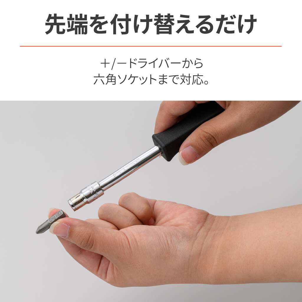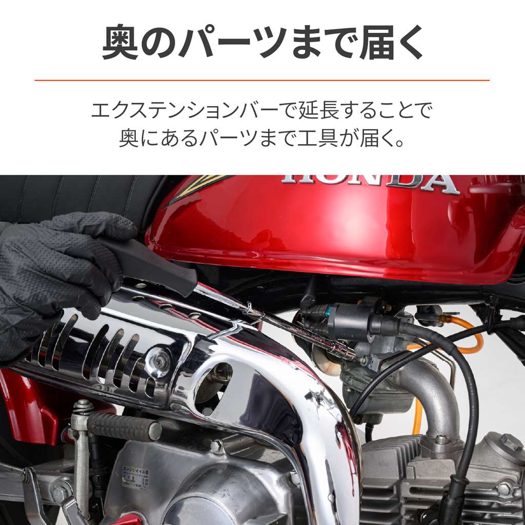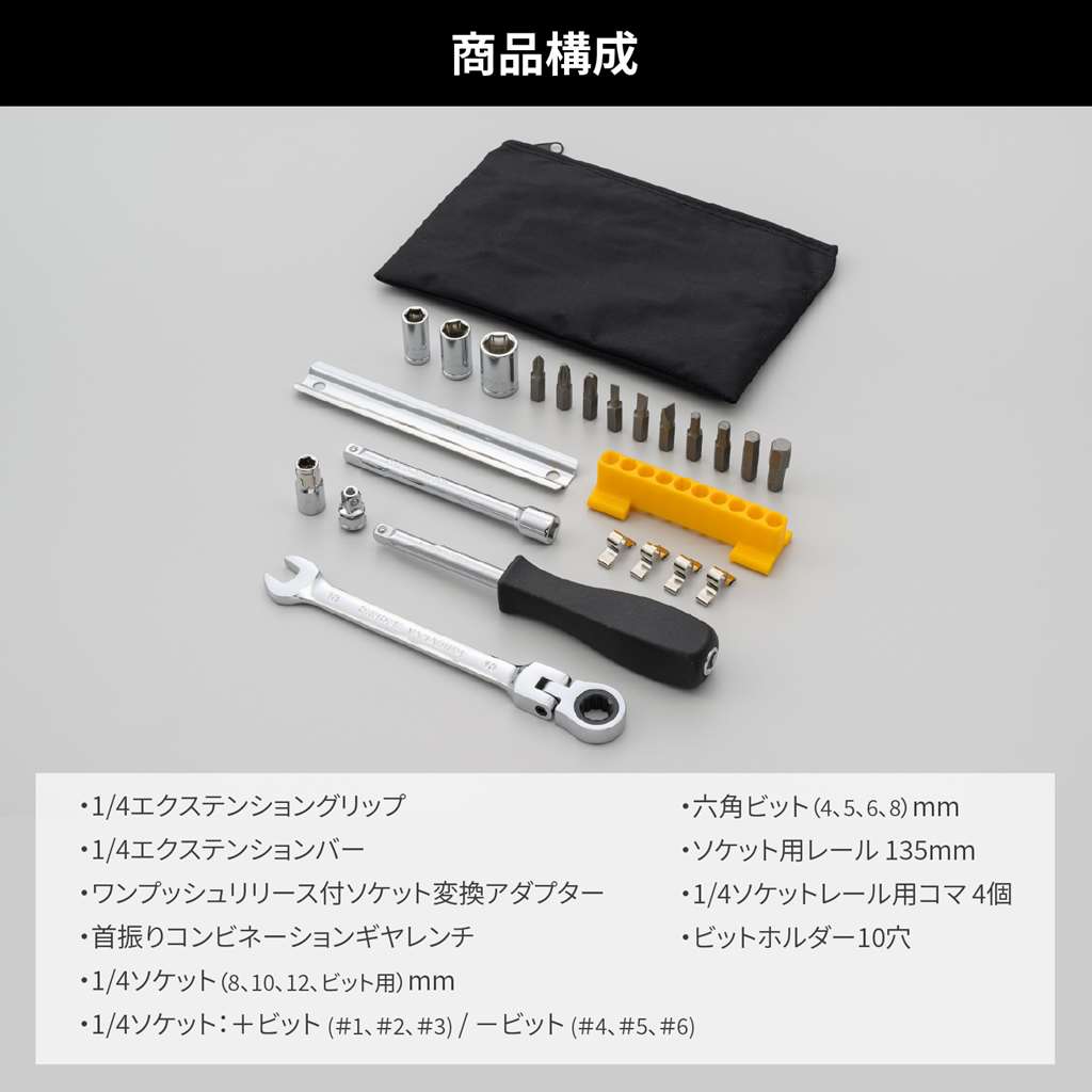 いざという時の車載ツールセット。ツーリング中のトラブルに対応するため、コンパクトながら役立つ工具をセットにしました。先端を付け替えるだけで+/−ドライバーから六角ソケットまで対応。グリップやエクステンションバーはギアレンチと連結可能。ラチェット機能により作業効率がアップします。エクステンションバーで延長すれば、奥にあるパーツまで工具が届くことで作業の幅が広がります。【セット内容】・1/4エクステンショングリップ・1/4エクステンションバー・ワンプッシュリリース付ソケット変換アダプター・首振りコンビネーションギヤレンチ・1/4ソケット(8、10、12、ビット用)mm・1/4ソケット:+ビット(#1、#2、#3) / ?ビット(#4、#5、#6)・六角ビット(4、5、6、8)mm・ソケット用レール 135mm・1/4ソケットレール用コマ 4個・ビットホルダー10穴バイク用車載工具セットツーリング中のトラブルに対応するため、コンパクトで役立つ工具のセット品先端を付け替えるだけで+/−ドライバーから六角ソケットまで対応グリップエンドにギアレンチを差し込むことで、ラチェット機構を追加エクステンションバーで延長すれば、奥にあるパーツまで工具が届く