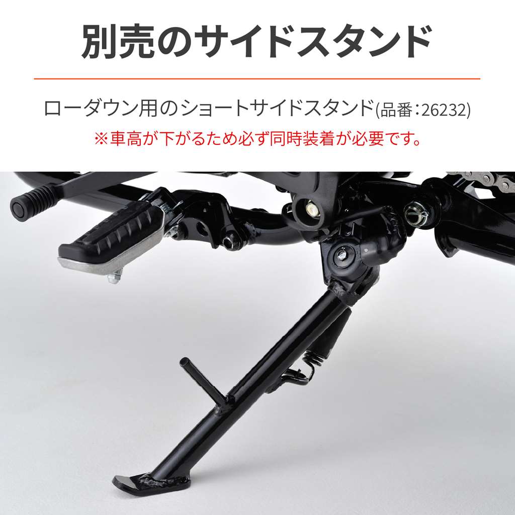 ローダウンながら純正以上の乗り心地、コーナーリング性能、ギャップ走破性を実現したアジャスタブルリアショック。アルミ製で軽量化にも貢献。30mmショートのローダウンスタイルから15mmショートのちょい下げまで、様々なスタイルにマッチします。純正のハードな乗り心地を改善車高調整幅(自由長):338-353mm(ノーマル長368mm)伸側減衰調整20段スプリングプリロード無段階調整式※ショートサイドスタンド(品番:26232)の同時装着必須です。※リアショックは伸側減衰調整20段です。21段以上まで動きますが減衰力は変化しません。※純正に比べ、センタースタンドを掛けるのが重くなります。