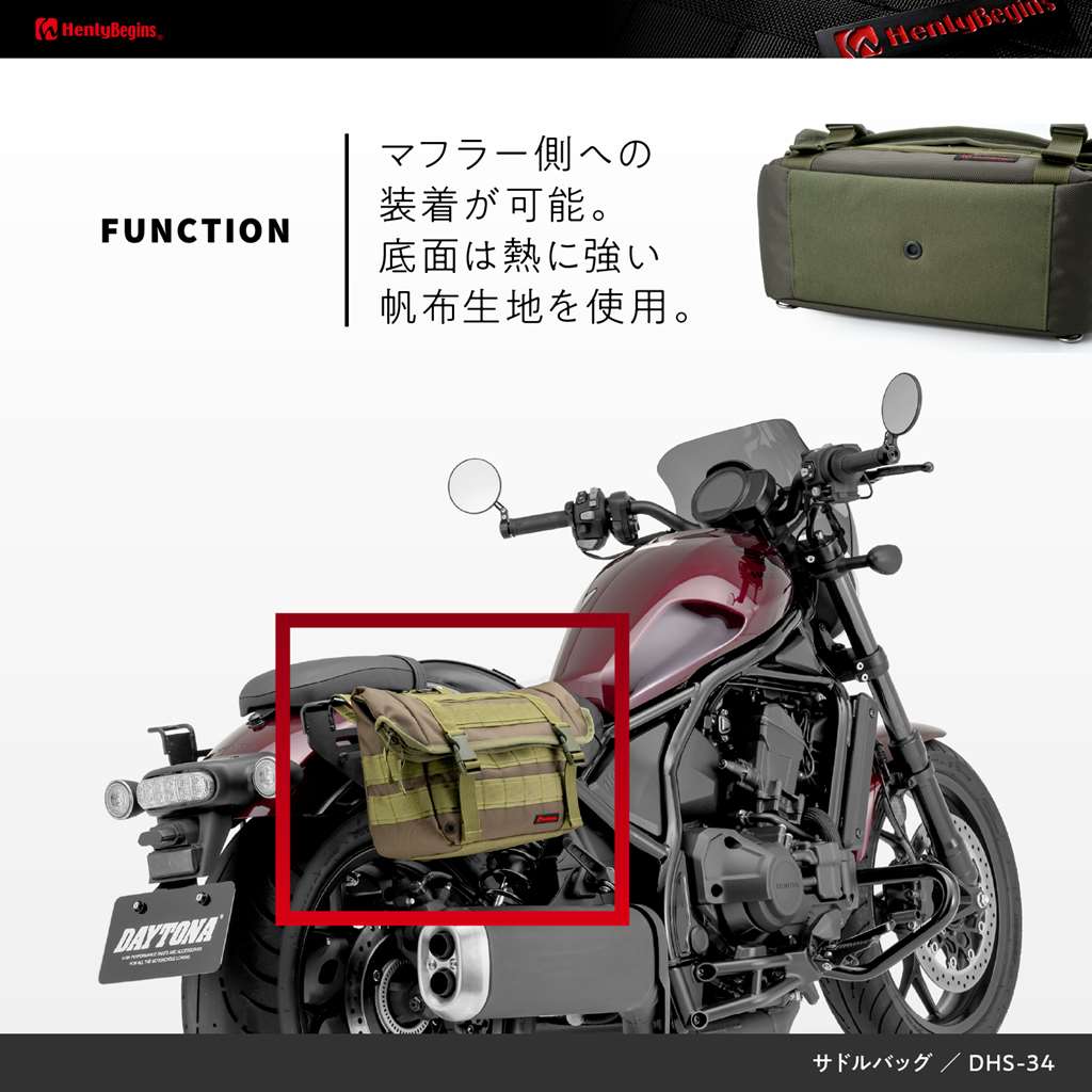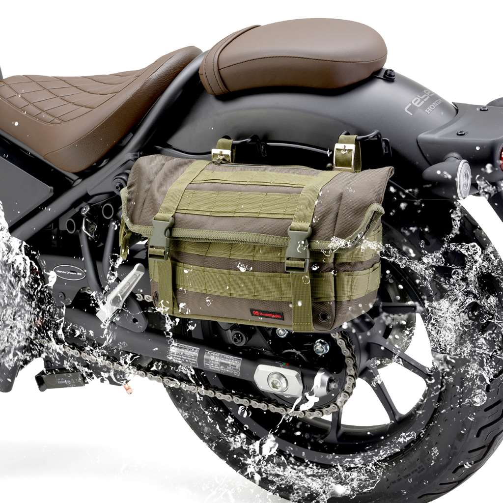 マフラー側に対応した防水サドルバッグ。容量:6L マフラー側対応サイズ:縦230×横280×幅120mm / 差込部有効幅:230mm特長:インナー防水構造 / マフラー側対応【インナー防水】インナー防水の採用で、見た目を損なわず高い防水効果を発揮。走行中の突然の雨でも安心。水の侵入を防ぐシーム加工を採用。【マフラー側への装着】マフラー熱に対応するため、底面に帆布生地を採用。【バッグサポート差し込み構造】背面部はサドルバッグサポートに差し込むだけで走行時の振れを抑制。背面下部にも固定用のDカン&ひもが付属。汎用性が高く、幅広い車種に装着が可能。【ワンタッチで簡単開閉】バックルによりワンタッチで開閉が可能。【盗難対策にリング付きファスナー】ファスナーはリング付きで、盗難抑止に別売りのダイヤルロックが使用可能。【生地選び】強度の高い1680デニールのポリエステル生地を採用。バイク用 防水サドルバッグ(マフラー側対応)インナー防水構造で突然の雨でも安心容量:6L、最大積載重量:2kgサイズ:縦230×横280×幅120mm / 差込部有効幅:230mm商品構成:金具付き固定ベルト×2、樹脂付き固定ベルト×2、ひも×2※レインカバーは付属しません。※バッグの装着には巻き込み防止バーとの同時装着が必要。※底面には熱に強い帆布生地を採用していますが、マフラーに接触しないように取り付けてください。