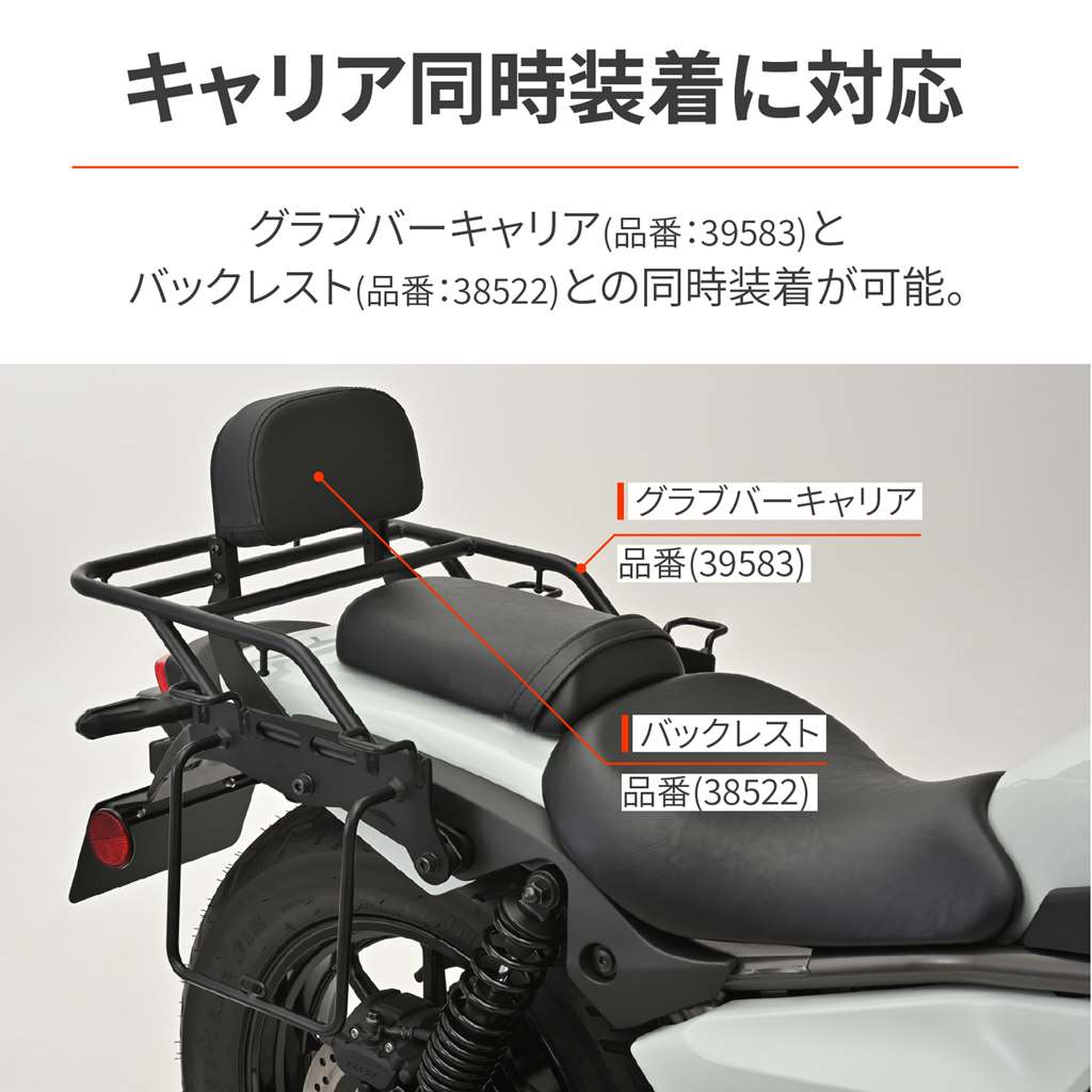 サドルバッグの安定性を高め、タイヤへの巻き込みを防ぐサポートバー。リアタイヤへの巻き込みを防止し、走行中の不安や危険を解消。バッグサポート部は縦方向に十分な長さを取ることで、サドルバッグがリアサスペンション、リアアクスルに接触しにくい形状に設計。ベルトループ一体型で、別途サドルバッグハンガーを用意する必要なし。ベルトループはネット用のフックとしても使用可能。サドルバッグのベルト左右ピッチ190mm前後のバッグに対応。(推奨バッグサイズ12L以下)バックレストキット(品番:38522)との同時装着可能。グラブバーキャリア(品番:39583)を同時装着する場合は、別途サドルバッグサポート取付キット(品番:15416)を使用することで同時装着可能。・推奨バッグサイズ12L以下右側専用リアタイヤへの巻き込みを防止し、走行中の不安や危険を解消ベルトループはネット用のフックとしても使用可能対応バッグ:ベルト左右ピッチ190mm前後のバッグ対応(推奨バッグサイズ12L以下)バックレストキット(品番:38522)とグラブバーキャリア(品番:39583)の同時装着が可能※純正以外のマフラーを装着している場合、マフラー形状/ステー取り出し方法によっては、右側サドルバッグサポートおよびバッグを取り付けできない場合があります。※純正以外のリアサスペンションに交換している場合、取り付けできない場合があります。※マフラーとサドルバッグのクリアランスは50mm以上確保した状態でご使用ください。※バッグ装着時は全幅が増えるため、走行には十分注意してください。
