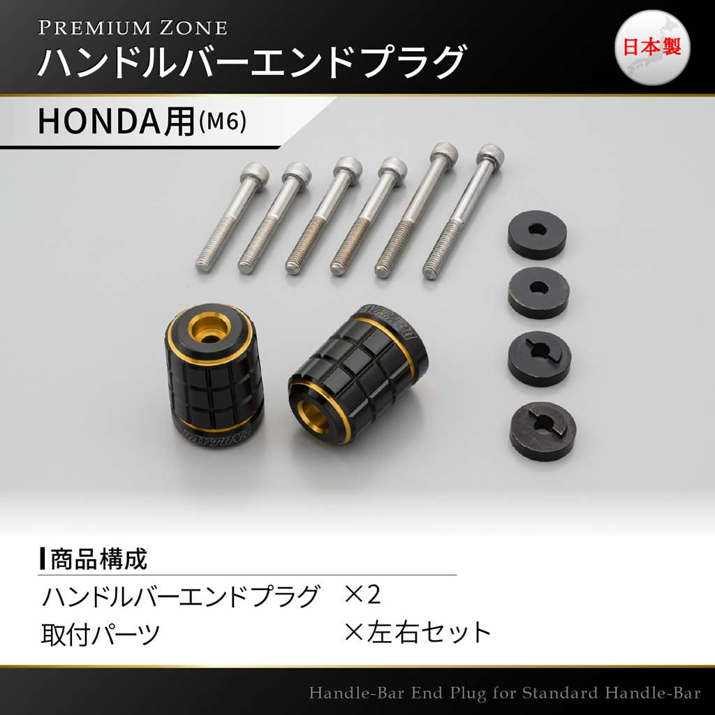 「創」と「麗」を極めた逸品PREMIUM ZONEシリーズのバーエンド。アルミの無垢素材から繊細で丁寧な加工で削り出し、2色の色彩がきわだつ優美なデュアルアルマイト仕上げ。こだわりの日本製。レンガをモチーフとしたブロックパターン。ごつごつした雰囲気で林道や悪路を走破するイメージのBRICK。M6ボルトで固定されているHONDA車の純正ハンドルに対応。付属カラーの組み合わせにより幅広い車種へ装着が可能です。HONDA車の純正インナーウエイトはそのままお使いいただけます。【デイトナ社確認車両】CB1300SF/SB/ST/SP(98-22)、CB1100/EX/RS(10-22)、CBR1000RR(07-10)、HAWK11(23)CB1000R(18-21)、NC750X(14-21)、NC750S(14-19)、NC700X(12-13)NC700S(12-13)、INTEGRA(12-14)、CB750(92-08)、CB650R(19-22)CBR650R(19-23)、CBR600RR(07-13,21-22)、CB400SF/SB(14-21)、CB400SS(04)CBR400R(16-22)、CB400FOUR(97)、400X(19-22)、CB250R(18-23)CB250F(17)、CBR250RR(17-22)、CBR250R(11-13)、CRF250RALLY(21-22)FORZA(04-18,21-22) MF08/MF10/MF12/MF13/MF15、FAZE(09-12) MF11、VTR250/F(13-17)PCX160(21)、ADV150(20-22) ※国内仕様のみ、PCX150(18/4-20)PCX125(18/4-21)、グロム(13-21)、LEAD125(13-22)、ハンターカブ(20-23)ダックス125(23)、モンキー125(22)、DIO110(15-17)、クロスカブ110(18-22)トゥデイ(12)、MT-09/SP(21-22)、YZF-R7(22)、GSX-1300Rハヤブサ(08-17)、GSX-S750(17)、バーグマン200(20)スウィッシュ(18-20)、アドレス125(18-20)GSX-R125(18-21)M6ボルトで固定されているHONDA車の純正ハンドルに対応アルミ削り出しで2色のコントラストが際立つデュアルアルマイト仕上げHONDA車の純正インナーウエイトはそのまま使用可能※本体はアルミ製です。メーカー別ハンドルに対応したアタッチメントはスチール製黒塗装仕上げです。※ハンドル最大幅が変更となります。車種によっては記載変更が必要です。