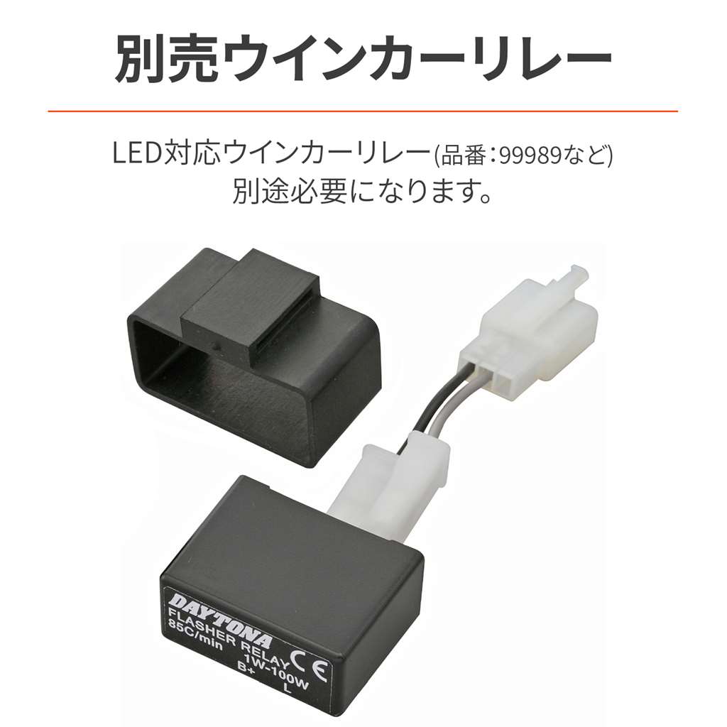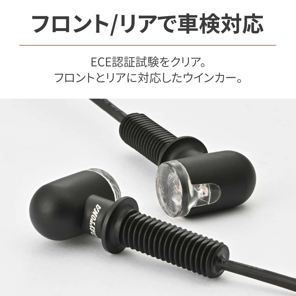 デイトナのオリジナルウインカー、D-Lightシリーズに超小型ウインカーが登場。取り付け車種を選ばない小型設計で、ウインカーの存在感を抑えました。小型でも高輝度LEDを採用することで、ウインカーとしての視認性を確保。Eマーク取得済で安心の車検対応品。・取り付け部:M8×24mm・配線長:約350mm・ギボシ端子:CA/CB104付属(スリーブ入り)レンズ直径12mmの小型LEDウインカーで車種を選ばず装着可能フロント、リアで車検対応 / ECE認証試験クリア防水(IPX7相当)取り付け部:M8×24mm / 直流12Vの二輪車専用品(12V 4W) ※デイトナのLED対応ウインカーリレーへの交換が必要です。純正がLEDウインカーであっても、リレー交換が必要となる場合があります。※取り付けにはハーネス加工が必要です。※ポジション機能はありません。