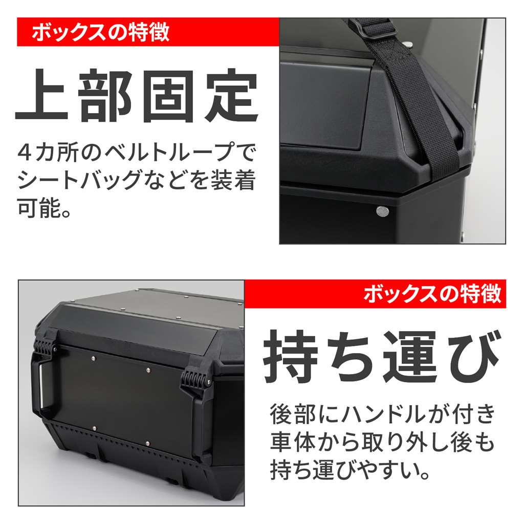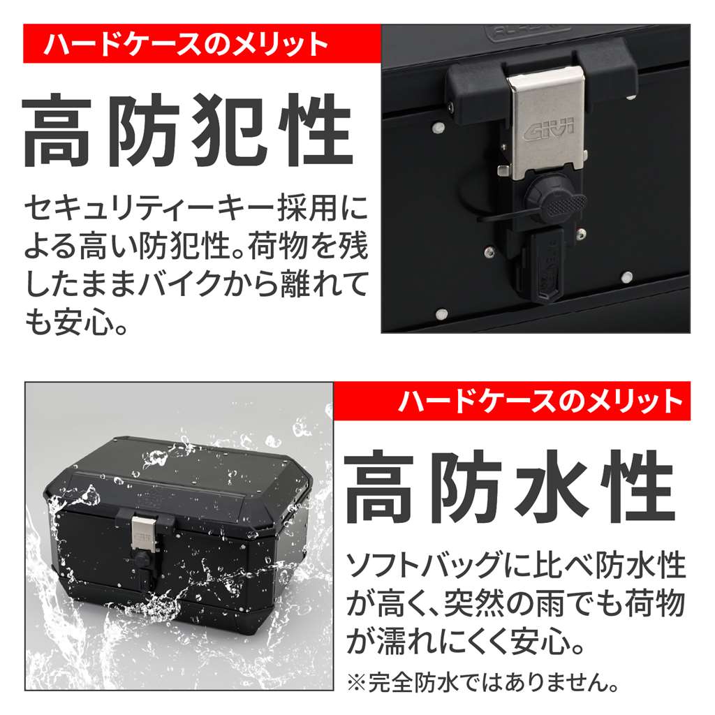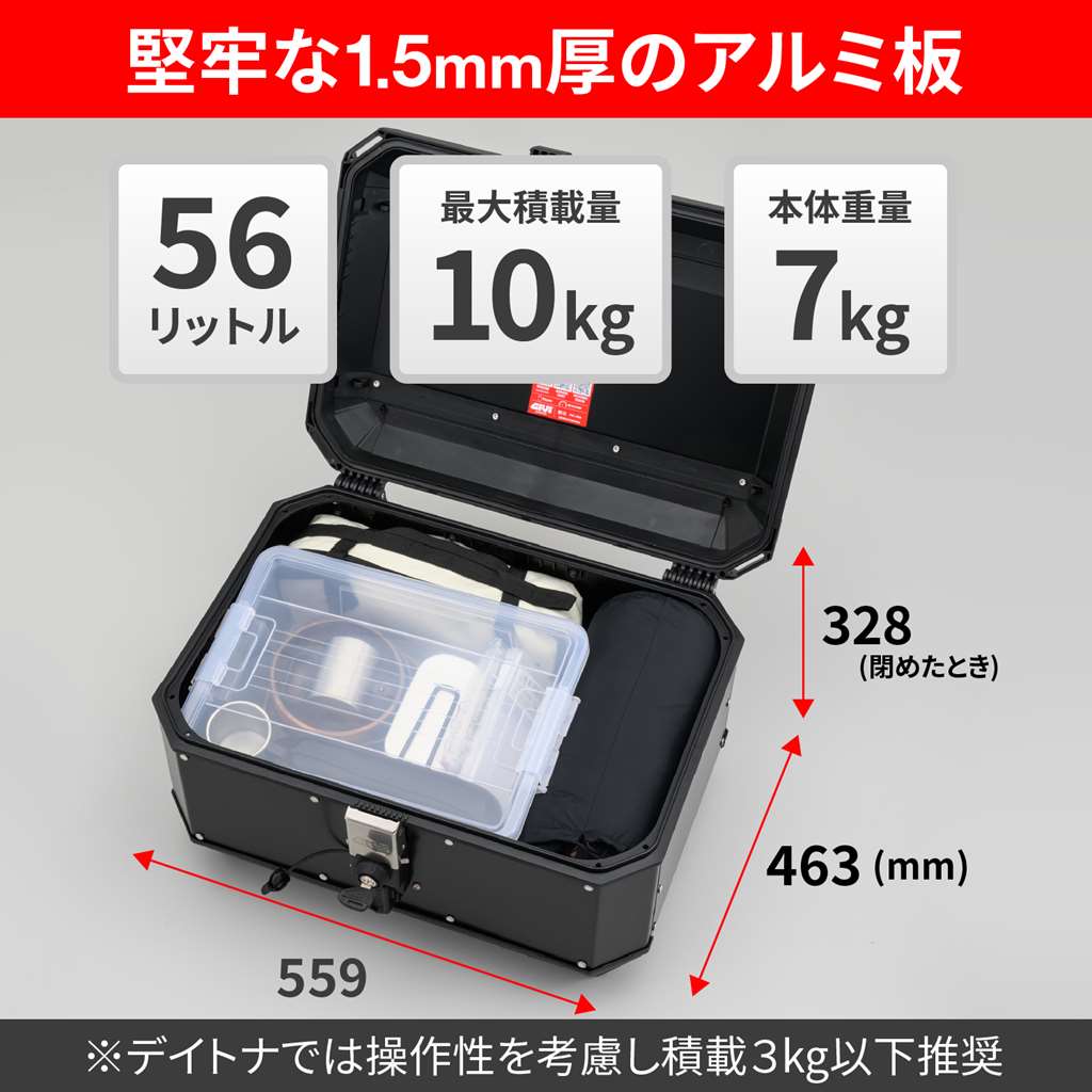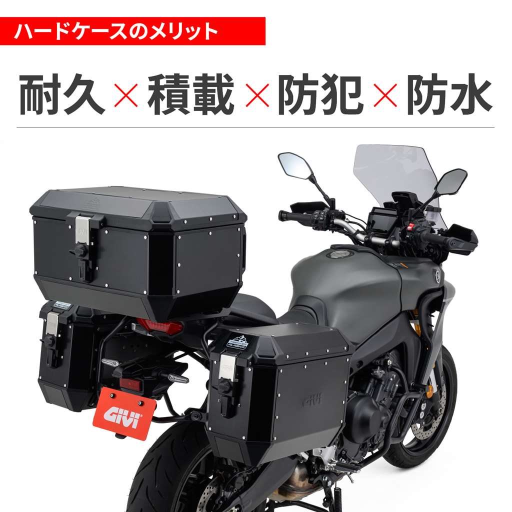 フラットデザインのアルミケース。4つのベルトループで高い拡張性。1.5mm厚のアルミ板をメイン素材とした堅牢な造りのアルミケース。GIVI独自のWIRELEASEシステムを採用し、ケース外部のノブを回すことで簡単にケースが脱着が可能。フラットなケース上面と4箇所のベルトループでシートバッグなどを装着可能。後部にハンドルが付き、バイクから取り外し後も持ち運びやすい。バイク用リアトップケース(モノキー)1.5mm厚のアルミ板を使った堅牢な造り4箇所のベルトループでケース上部にシートバッグなど装着可能容量:56L、最大積載重量:10kg外寸:奥行463×幅559×高さ328(mm)、総重量:7kg (※外寸奥行は取っ手を含みます)※フィッティングの積載制限以上は積載しないでください。※ベース別売り。車種別フィッティング(別売り)指定モノキーベース(M3/M5など)を使用。接点付きベースには取り付けできません。※防水性を考慮した設計をしておりますが、完全防水ではありません。※この商品は素材独自の風合いを出すために、アルミ部分に表面処理を行なっておりません。手あかや水あかなどの汚れが定着しやすい傾向にあります。