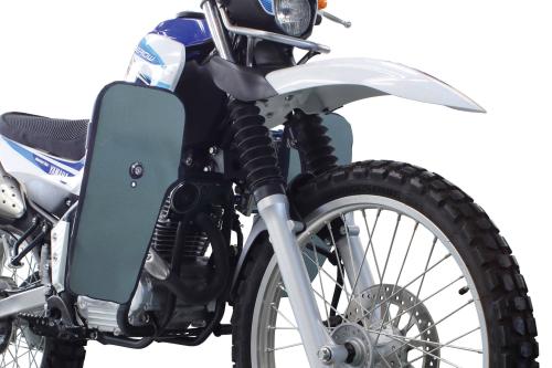 本製品を装着することで、立ちごけ等の軽度な転倒に対し、エンジンやチェンジペダルへのダメージを軽減します。又、付属のレッグシールドをサイドバンパーに装着することで、風防効果を得ることができます。これにより、ライダーの疲労を軽減すると共に走行中、フロントタイヤが巻き上げる水や泥などから自身を守ることが出来ます。レッグシールド(左右)の装着は、裏面にあるベルクロをパイプに巻きつけ、中央にあるボスにスチール製ボルトとアルミ削り出しリテーナーでしっかりと固定します。この固定部分のボスには、フォグランプキット(別売)を装着することができます。更にサイドバンパー本体のストレート部分には、アクションカメラやペットボトルホルダー(別売)なども装着できます。サイドバンパー本体:スチール製パイプブラック塗装仕上げ。レッグシールド:強化ナイロン製シールドの生地自体には、防水加工は施しておりません。使用する場合は必ず防水スプレーにて防水加工を行い装着してください。