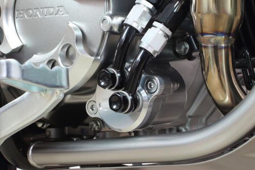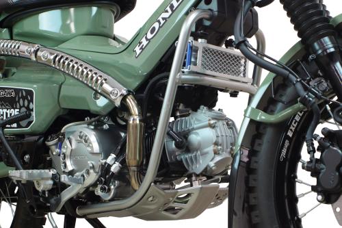 外気温の上昇に伴う、油温の上昇を抑え、安定したエンジン出力を維持するコンパクトクールキット。オイルクーラー本体の取り付け位置付属のオイルクーラーステーを取り付け、フレーム下に固定します。オイル取り出し口純正クラッチカバーのオイルフィルター部に専用のオイルフィルターカバーを装着し、オイルの取り出しを行います。オイルフィルターカバーの内部にはリリーフバルブ機構を備えています。更にネオジウムマグネットを内部に装備している為、エンジンオイルに混じった鉄粉を吸着し、オイルフィルターへの汚れを軽減します。コンパクトクール本体についてコンパクトクール本体についてクーラー本体は冷却効果に優れたコンパクトクールを採用。オイルクーラーを取付けることで、エンジンボアアップに伴う油温上昇を抑えることが出来ます。オイルクーラープレート、ガードが標準装備。注意事項※ノーマルクラッチカバー専用です。※ノーマルマフラーは装着出来ません。※SP武川製レッグバンパー&シールドキット又はサブフレームキットと同時装着する場合、別途ボタンヘッドスクリュー(00-00-0749)が必要になります。※オイル量は通常規定オイル量に約40ccを追加して下さい。