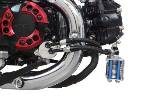 オイルクーラー本体の取り付け位置ノーマルシリンダーヘッドのタペットカバーに専用の取り付けブラケットを装着し、シリンダーヘッド下にオイルクーラー本体を固定します。オイル取り出し口純正クラッチカバーのオイルフィルター部に専用のオイルフィルターカバーを装着し、オイルの取り出しを行います。オイルフィルターカバーの内部にはリリーフバルブ機構を備えています。更にネオジウムマグネットを内部に装備している為、エンジンオイルに混じった鉄粉を吸着し、オイルフィルターへの汚れを軽減します。コンパクトクール本体についてクーラー本体は冷却効果に優れたコンパクトクールを採用。オイルクーラーを取付けることで、エンジンボアアップに伴う油温上昇を抑えることが出来ます。オイルクーラープレート、ガードが標準装備。注意事項※ノーマルシリンダーヘッド、ノーマルクラッチカバー専用です。※SP武川製エンジンガードとの同時装着は出来ません。※悪路走行やオフロードでの使用は、行わないで下さい。※オイル量は通常規定オイル量に3フィン:約40ccを追加して下さい。※SP武川製スポーツマフラー・トルネードマフラーを装着する場合、バンジョーの取り付け変更とブレードホース320mm(1本)の別途購入が必要になります。