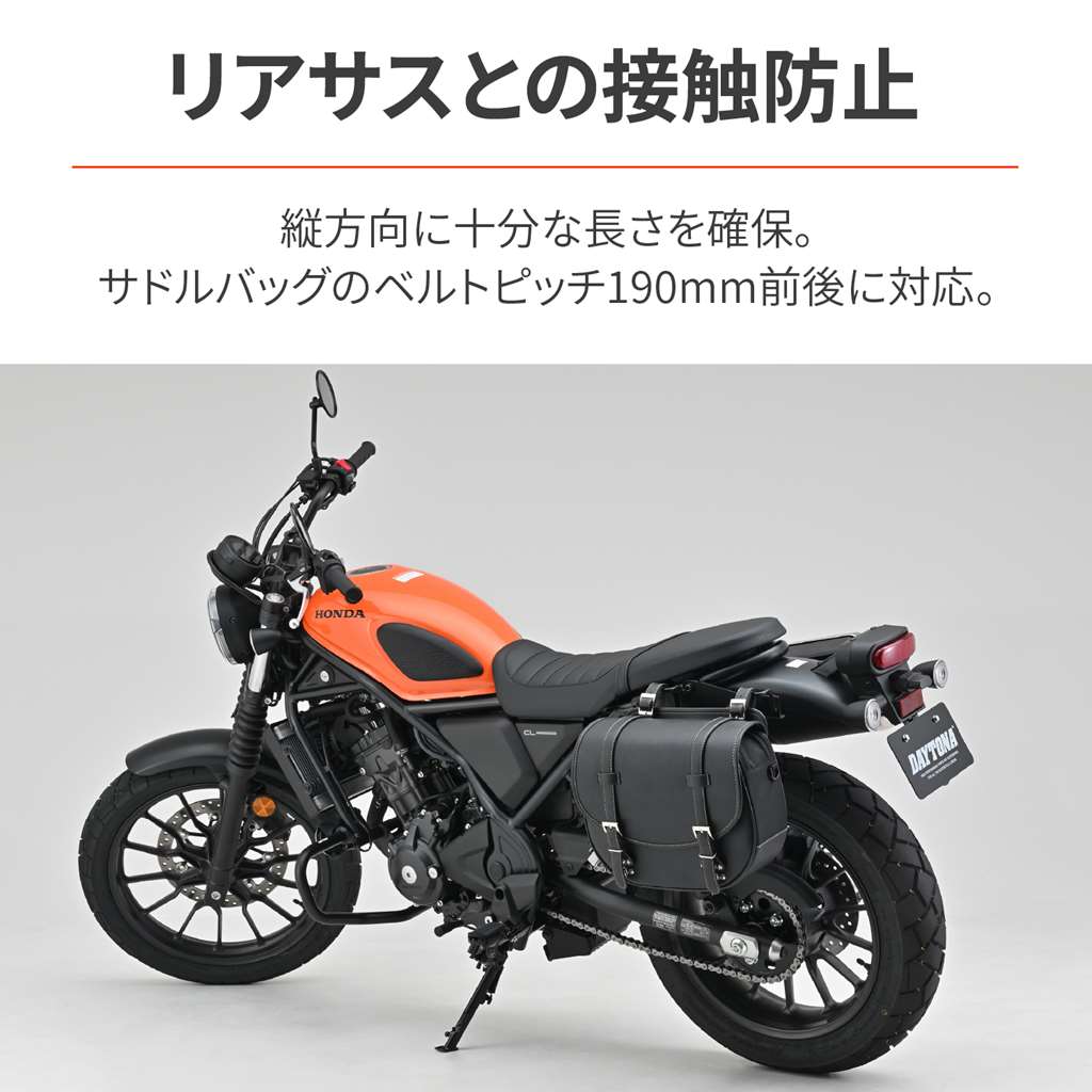 サドルバッグの安定性を高め、タイヤへの巻き込みを防ぐサポートバー。リアタイヤへの巻き込みを防止し、走行中の不安や危険を解消。バッグサポート部は縦方向に十分な長さを取ることで、サドルバッグがリアサスペンション、リアアクスルに接触しにくい形状に設計。ベルトループ一体型で、別途サドルバッグハンガーを用意する必要なし。ベルトループはネット用のフックとしても使用可能。サドルバッグのベルト左右ピッチ190mm前後のバッグに対応。グラブバーキャリア(品番:32719)を同時装着可能。・推奨バッグサイズ12L以下左側専用バッグのリアタイヤへの巻き込みを防止し、走行中の不安や危険を解消ベルトループはネット用のフックとしても使用可能対応バッグ:ベルト左右ピッチ190mm前後のバッグ対応(推奨バッグサイズ12L以下)グラブバーキャリア(品番:32719)の同時装着が可能※純正以外のリアサスペンションに交換している場合、取り付けできない可能性があります。※バッグ装着時は全幅が増えるため、走行には十分注意してください。