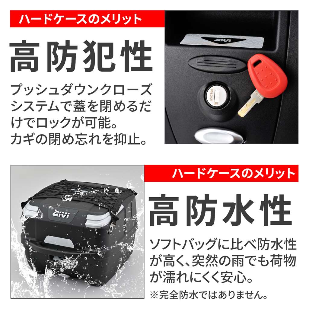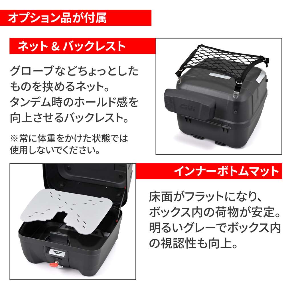 通勤・通学に最適モデル。33Lのモノロックケース。A4サイズのビジネスバッグに対応。フルフェイスヘルメット1個が入るサイズ。B33シリーズに「バックレスト、インナーボトムマット、ネット&フック」のオプション品を追加したモデル。蓋を閉めるだけでロックができるプッシュダウンクローズシステムを採用。モノロック用の汎用ベース付属。・ボックス外寸:奥行433×幅405×高さ306mm・内寸:奥行360×幅370×高さ300mm・総重量(ベースプレート込み):3.6kg・最大積載重量:3.0kgバイク用リアトップケース(モノロック)B33シリーズに「バックレスト、インナーボトムマット、ネット&フック」のオプション品 追加モデルA4サイズのビジネスバッグに対応、フルフェイスヘルメット1個が入るサイズ容量:33L、最大積載重量:3kg外寸:奥行433×幅405×高さ306(mm)、総重量:3.6kg※キャリア本体の積載制限以上は積載しないでください。※防水性を考慮した設計をしておりますが、完全防水ではありません。※構造上カギの閉じ込み(インロック)ができてしまいます。十分注意してください。※商品付属の汎用ベース、またはM6M(別売り)専用。M5M/MM(別売り)はベースラバーが接触しないため、本品には使用しないでください。
