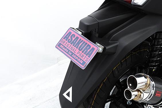 フェンダーレスはビッグスクーター定番のカスタムで、ドレスアップのワンポイントには欠かせないパーツです。装着によってリアビューをスタイリッシュにスッキリとドレスアップできます。素材は耐腐食性、強度に優れたSUS304ステンレス製で、表面処理はポリッシュ仕上げを施しています。付属のステー、ボルト類を使用してお手軽に簡単に装着できます。純正ナンバー灯を流用して取り付けできるようになっています。リフレクター(反射板)は車両に装備されているものを流用しますので、改めて用意する必要はございません。フェンダーレスキットは、長い純正フェンダー(泥よけ)を取り外すことにより、すっきりとしたリア周りに仕上げることを目的とした商品です。またリア周りのメンテナンスやレース等の使用における空気抵抗を抑える理由から、浅倉商事製品はナンバープレートホルダーの角度を変更することができる設計になっています。しかし、道路交通法の保安基準ではリフレクター(反射板)の装着義務やナンバープレートの角度を約45度以内(後方からナンバープレートを目視で確認できる角度)とすることが定められております。浅倉商事製品は仕様としてナンバープレートホルダーの角度調節することは可能ですが、一般公道等の道路交通法を遵守しなければならない道路では保安基準を超えた角度(正確に目視できない角度)での製品の使用は法律で禁じられておりますので絶対におやめください。