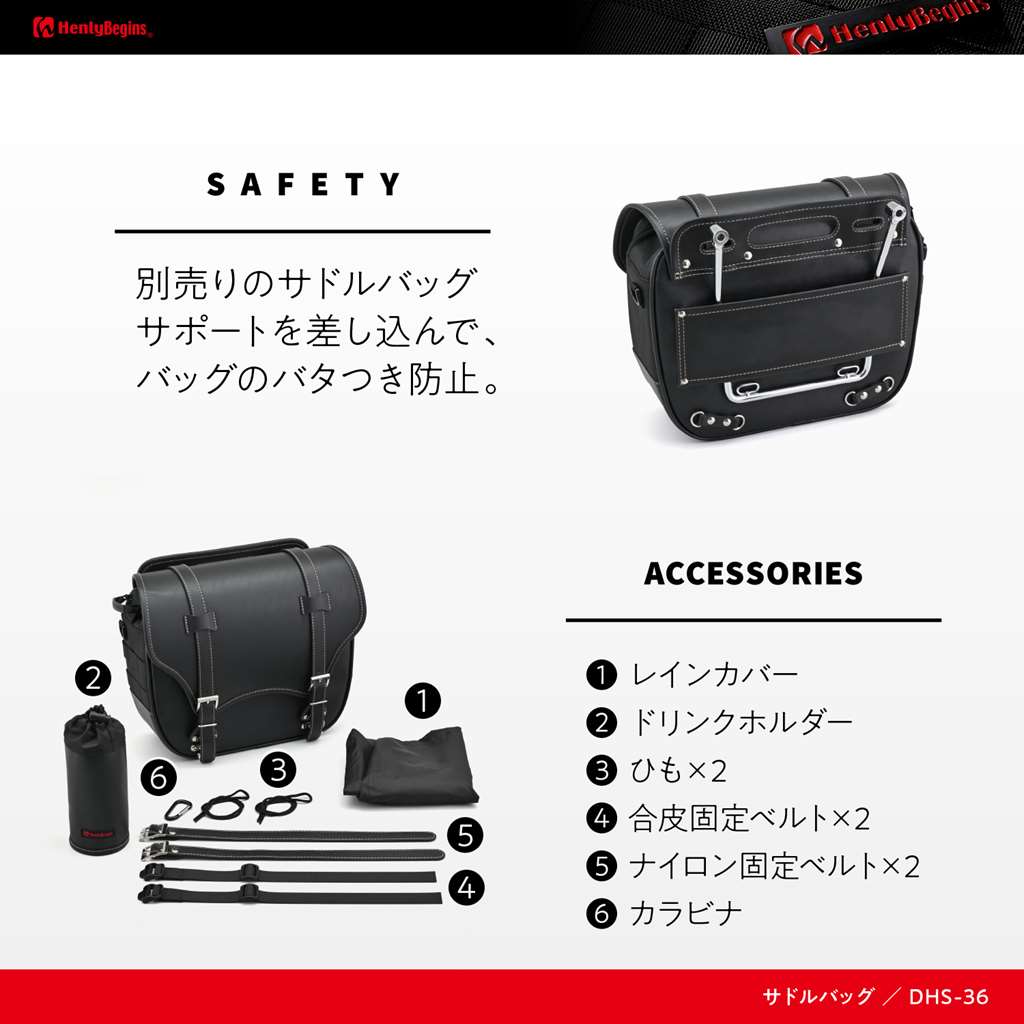 クルーザーやストリートモデルに合う特徴的なフラップデザイン。容量:12Lバッグ本体の素材/材質:合成皮革×1680Dポリエステルサイズ:縦270×横360×厚み120mm【バッグサポート差し込み構造】背面部はサドルバッグサポートに差し込むだけで走行時の振れを抑制。背面下部にも固定用のDカン&ひもが付属。差込み部のプレートには穴が設けられている為、付属ベルトでしっかりと固定が可能。汎用性が高く、幅広い車種に装着が可能。【2種類の固定ベルトが付属】合皮固定ベルトは強度と美しさを両立。ナイロンベルトは薄くて、純正シートレールとフェンダーの隙間に通しやすい設計。【赤い裏地の採用】ライダースをイメージした赤い裏地により、中の荷物が見つけやすい。書類や小物の収納に便利なファスナーポケットを装備。【ワンタッチ金具で簡単開閉】スタイル重視のワンタッチ金具の採用。【盗難対策にリング付きファスナー】ファスナーはリング付きで、盗難抑止に別売りのダイヤルロックが使用可能。【ボトルホルダー標準装備】内側に保冷保温素材を採用。カラビナによりバッグから外して持ち歩きに便利。【ベルト固定部に角カンの採用】力の掛かるベルト固定部には角カンと呼ばれる樹脂パーツを採用して強度をアップ。【生地選び】本革の風合いに近くメンテナンスのしやすい合成皮革と強度の高いポリエステル生地を採用。バイク用サドルバッグ材質:合皮×1680Dポリエステル容量:12L、最大積載重量:5kgサイズ:縦270×横360×厚み120mm商品構成:レインカバー、ドリンクホルダー、合皮固定ベルト×2、ナイロン固定ベルト×2、緩み止めアジャスター×2、ひも×2、カラビナ×1※バッグの装着には巻き込み防止サドルバックサポートとの同時装着が必要。