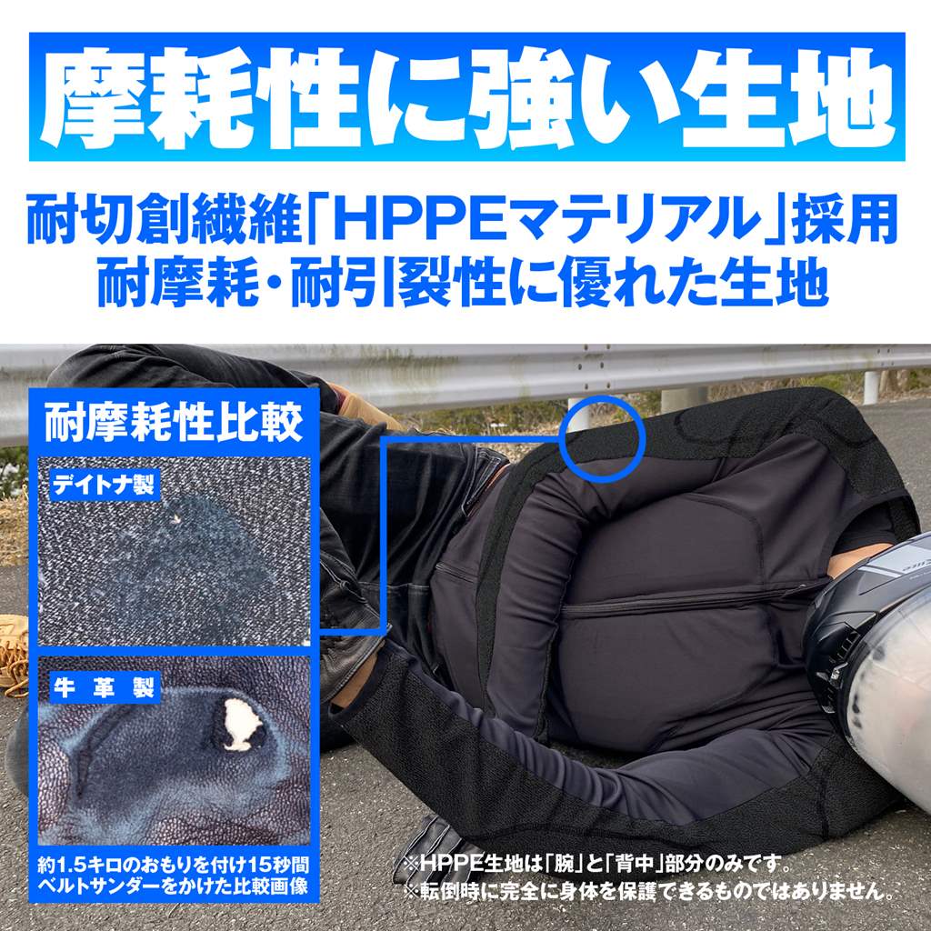 通気性と速乾性に優れるメッシュ生地と耐摩耗性、耐引裂性に優れる「HPPEマテリアル」を組み合わせたインナープロテクターウエア。夏でも涼しく着れるメッシュ生地を採用していますが、インナーとして使うことでオールシーズン使用可能。胸、肩、ひじ、背中には、CE規格をクリアした安全性と体にフィットする装着感の良いプロテクターが付属。プロテクターはシート状でフレキシブルに追従する新型SAS-TEC「トリプルフレックスシート」を採用。プロテクターの目立ちにくさと、つけていることを忘れるほどの動きやすさを実現。シルエットはタイト目なスリムフィット形状。・本体: メッシュ生地:ポリエステル85%、ポリエチレン15%・HPPE: ポリエチレン45%、ポリエステル26%、ナイロン18%、グラスファイバー11%・裏地:ストレッチ生地:ポリエステル88.3%、ポリエチレン11.7%夏でも涼しく着れる通気性と速乾性に優れるメッシュ生地。インナーとして使うことでオールシーズン対応耐摩耗性、耐引裂性に優れる「HPPEマテリアル」を腕から背中にかけて採用。その他にはメッシュのストレッチ生地を採用プロテクターはフレキシブルに体に追従する「トリプルフレックスシート」を採用プロテクターの目立ちにくさと、つけていることを忘れるほどの動きやすさを実現付属プロテクター:SAS-TEC製トリプルフレックス:胸(CEレベル1)、肩(CEレベル1)、ひじ(CEレベル1)、背中(CEレベル1)※身長目安は体型によりあてはまらない場合があります。その他表示は製品寸法です。ヌードサイズ(目安サイズ)ではありません。