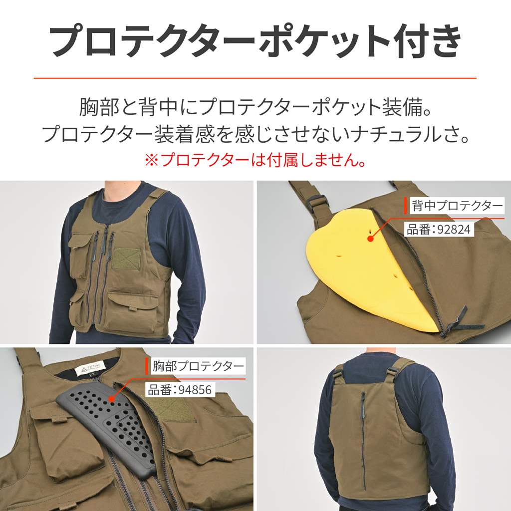 キャンプからタウンユースまで幅広く使えるアウトドアベスト。キャンプをしたいライダーのために、胸部と背中プロテクターが装備できるポケット付き。プロテクターをつけたまま街中を歩けるように、プロテクターの装着感を抑えました。大型・小型のポケットを多数装備しているため、スマホからキャンプグッズまで手ぶらで持ち運びできます。ショルダーベルトによる高さ調整で、ピッタリサイズからラフな着こなしまでシーンに合わせて調整可能。・対応プロテクター:胸部(品番:94856)、背中(品番:92824)・表生地:コットン100%キャンプからタウンユースまで幅広く使えるアウトドアベスト大型・小型のポケットを多数装備。スマホからキャンプグッズまで手ぶらで持ち運び胸部と背中プロテクター用のポケット付き対応プロテクター:胸部(品番:94856)、背中(品番:92824)ショルダーベルトにより、シーンに合わせて高さ調整可能※プロテクターは付属しません。