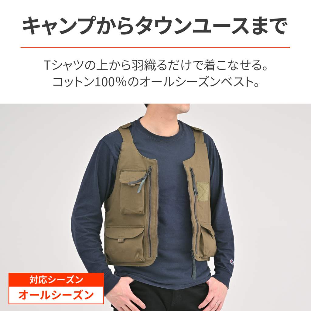 キャンプからタウンユースまで幅広く使えるアウトドアベスト。キャンプをしたいライダーのために、胸部と背中プロテクターを標準装備。SAS-TECプロテクターを採用しているため、普段やわらかく衝撃に応じて硬度変化する装着感の良いプロテクターが付属。プロテクターをつけたまま街中を歩けるように、プロテクターの装着感を抑えました。大型・小型のポケットを多数装備しているため、スマホからキャンプグッズまで手ぶらで持ち運びできます。ショルダーベルトによる高さ調整で、ピッタリサイズからラフな着こなしまでシーンに合わせて調整可能。・表生地:コットン100%キャンプからタウンユースまで幅広く使えるアウトドアベスト大型・小型のポケットを多数装備。スマホからキャンプグッズまで手ぶらで持ち運びSAS-TECの胸部と背中プロテクターが付属普段やわらかく衝撃に応じて硬度変化する装着感の良いプロテクターショルダーベルトにより、シーンに合わせて高さ調整可能