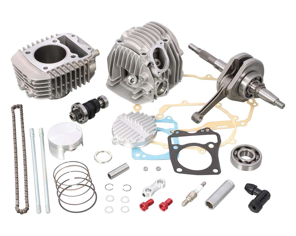 より高度な性能と耐久性を設計思想に盛り込んだボアアップKIT。燃焼室形状を最適化させた付属のシリンダーヘッドには高効率なポート形状、ビッグバルブを採用。その他専用ハイカムシャフト、各排気量に最適なハイコンプピストンの採用で、強烈なトルクとフラットな吹け上がりが体感できます。※装着にはビッグスロットルKIT(NEOシリンダーヘッド用)、大容量インジェクター、I-MAP等の車種に応じた推奨パーツが必要です。アルミ鋳鉄スリーブシリンダー排気量:181ccボア径:φ63ストローク:57.9mm(ノーマル)圧縮比:11.5:1無鉛プレミアムガソリン仕様※デコンプ機能はありません。※125ccを超過する為、一般公道では使用できません。
