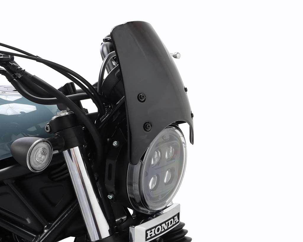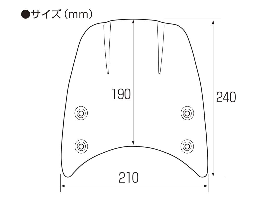 フロント周りを引き締めるポリカーボネイト製の小型バイザー。※バイザー本体の材質特性、また製造工程上で多少のキズ、汚れ等があります。予めご了承の上、お買い求めください。ボルトオンスクリーン:ポリカーボネイト製取付ステー:スチール製ブラック塗装仕上げスクリーンサイズ(縦×横):約190mm×210mm