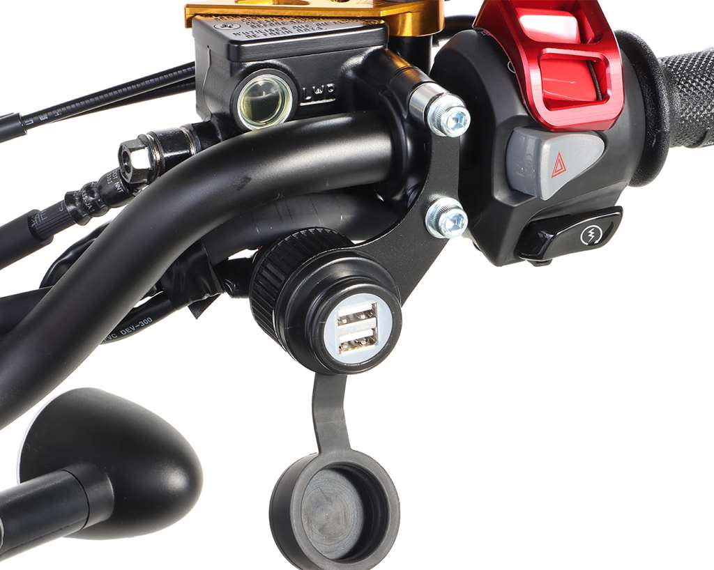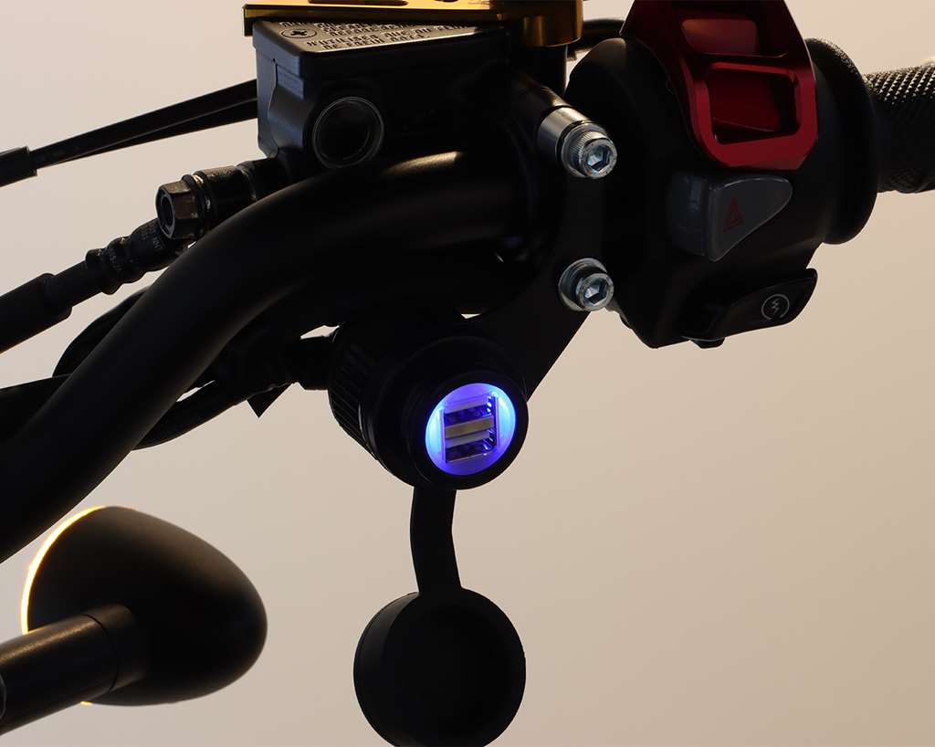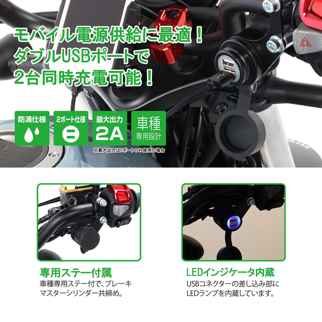 モバイル電源供給に最適な2ポートタイプのUSB電源に専用ハーネスを付属した車種専用タイプです。※完全防水ではありません。洗車・雨天時は使用しないで下さい。また使用しないときは付属のゴムキャップを必ず装着してください。※温度変化等により本体(ゴムキャップ)内部に結露が発生する恐れがあります。温度変化の激しい場所(エンジン周り)は避け、こまめに確認し水滴は除去してください。(エアダスター、掃除機等で水滴を除去して下さい。)トラブルの原因になる可能性があります。USBポート:1,000mA×2個DC5V 最大出力:2,000mA(1ポートのみ使用の場合)防滴仕様LED内蔵(ブルー)電源取り出し箇所:オプション端子※付属リレー装着の為、シート下バッテリーカバーを脱着する作業が必要です。