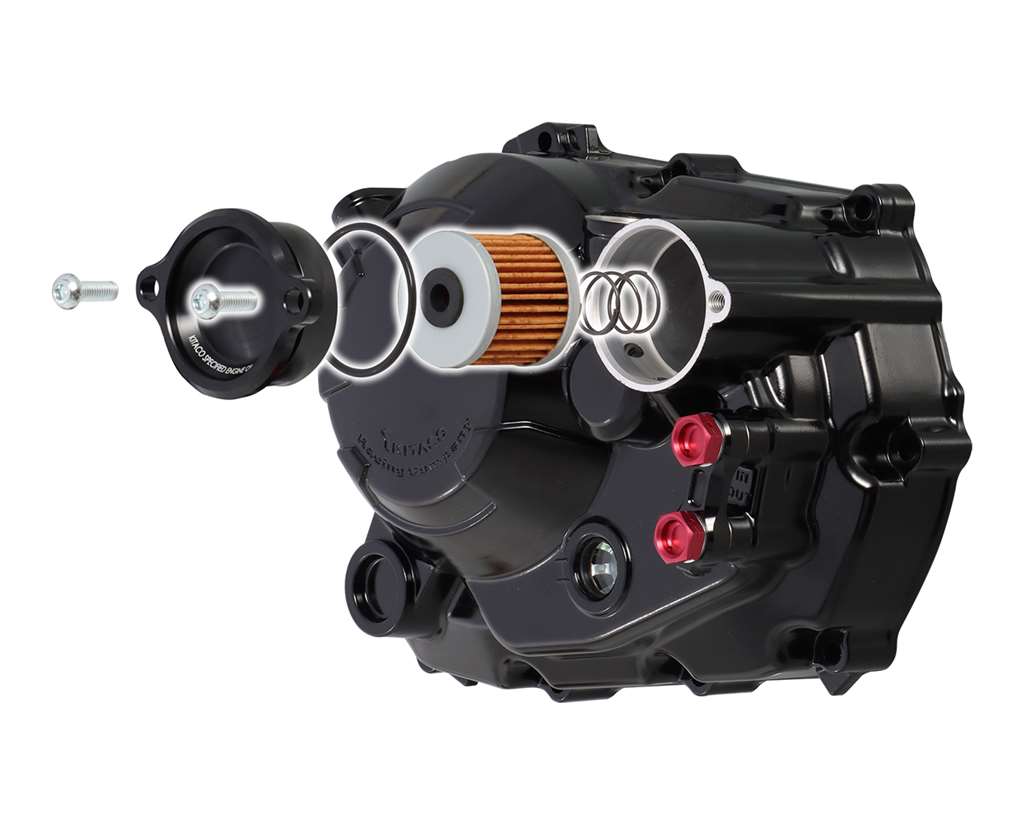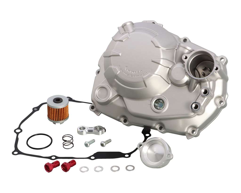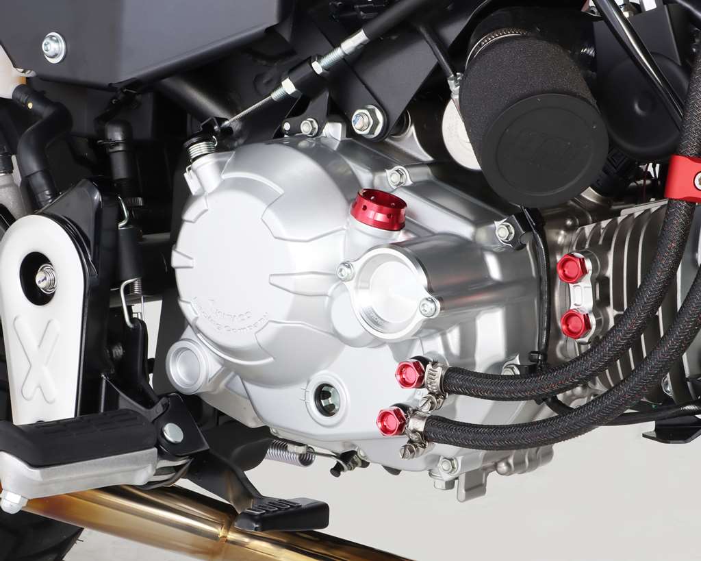 グロム系エンジン車用のアルミダイキャスト製のスポーティーかつ高品質なクラッチカバーです。オイルフィルターの内蔵やオイルクーラーの取り出し口を設け、レースからストリート車のカスタムまで幅広く対応。内部のクラッチ本体はノーマルクラッチに対応します。※このKITはクラッチカバーASSYのみの販売です。内部のクラッチ本体は付属していません。※モンキー125はノーマルマフラー、アップタイプマフラー使用不可。オイルクーラー用のオイルライン取出しにマフラーと干渉します。