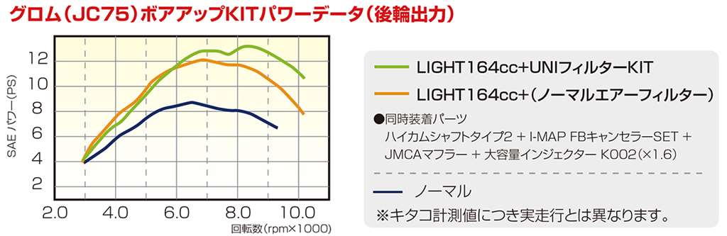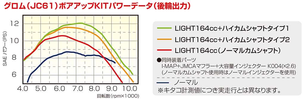 ノーマルシリンダーヘッドをそのまま使用できるボアアップKITです。排気量アップによるパワー、トルクアップを実現。特にトルクは中速域からノーマルをはるかに上回り、扱いやすい特性としています。※装着にはI-MAPの他、大容量インジェクター、ハイカムシャフト等が必要です。(チューニング度合いにより必要なパーツが異なります。)アルミ鋳鉄スリーブシリンダーピストン:鋳造(3R)仕様排気量:164ccボア径:φ60ストローク:57.9mm(ノーマル)圧縮比:11.1:1無鉛プレミアムガソリン仕様※125ccを超過する為、一般公道では使用できません。