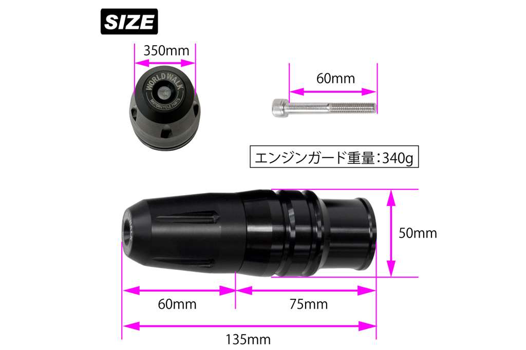 ・重量:340g・材質:(本体)アルミ・(スライダー)ジュラコン(R)・(ボルト)ステンレス・サイズスペック:※詳細サイズは上部の画像参照・付属品:エンジンガード本体・取り付けボルト×1本※転倒の仕方によっては未装着時と比べてダメージが大きくなる事もございます。※製品は予告なく仕様変更をする場合もございます。誠に恐れ入りますが予めご了承ください。※ご自身でお取り付けを行った場合は如何なる場合も補償の対象外となります。恐れ入りますがご理解いただけますと幸いです。※本製品は補修用です片側1本のみのセット内容となっております。Vストローム250の補修用(片側1本)のエンジンガードです。アドベンチャーモデルのバイクの中では比較的取り回しや操作性も良いと言われるVストロームですが、立ちごけリスクは0ではありません。車体からしっかりとガードが張り出す形となっており、立ちゴケや転倒時などに車体のダメージを軽減してくれます。ブラックアルマイト仕上げの為、車体に取り付けても悪目立ちしません。
