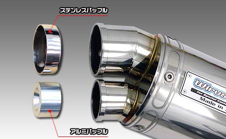 ※2010年(平成22年)4月1日より施行された認証制度に適合する認証マフラーではありません。ご理解の程よろしくお願い致します。落ち着きのあるハイクオリティーデザインでシンプルに仕上がっています。排気口は大小2本出しでSUS304ステンレス削りだし部材を採用しており、非常に高級感の高いデザインになっています。性能面では排圧によるコントロールで低速から高速までスムーズな走行を実現しています。消音用のバッフルが2個装備されている【 ダブルバッフル仕様 】となっており、バッフル無し、バッフル1個装着、バッフル2個装着と3種類の排気音を選べるサウンドセレクトスタイルになっています。バッフルはSUS304ステンレスタイプとアルミタイプの2種類のバッフルが装備されています。音量バッフル2個装着時の排気音量が 約86db(法定音量規制値内)バッフル1個装着時の排気音量が 約88db(法定音量規制値内)バッフル非装着時の排気音量が 約90db(法定音量規制値内)(法定音量規制値内) です。取り付けはサイレンサーバンドを使用してしっかり2点止めで固定きます。耐久性、耐腐食性の高いSUS304ステンレス製です。