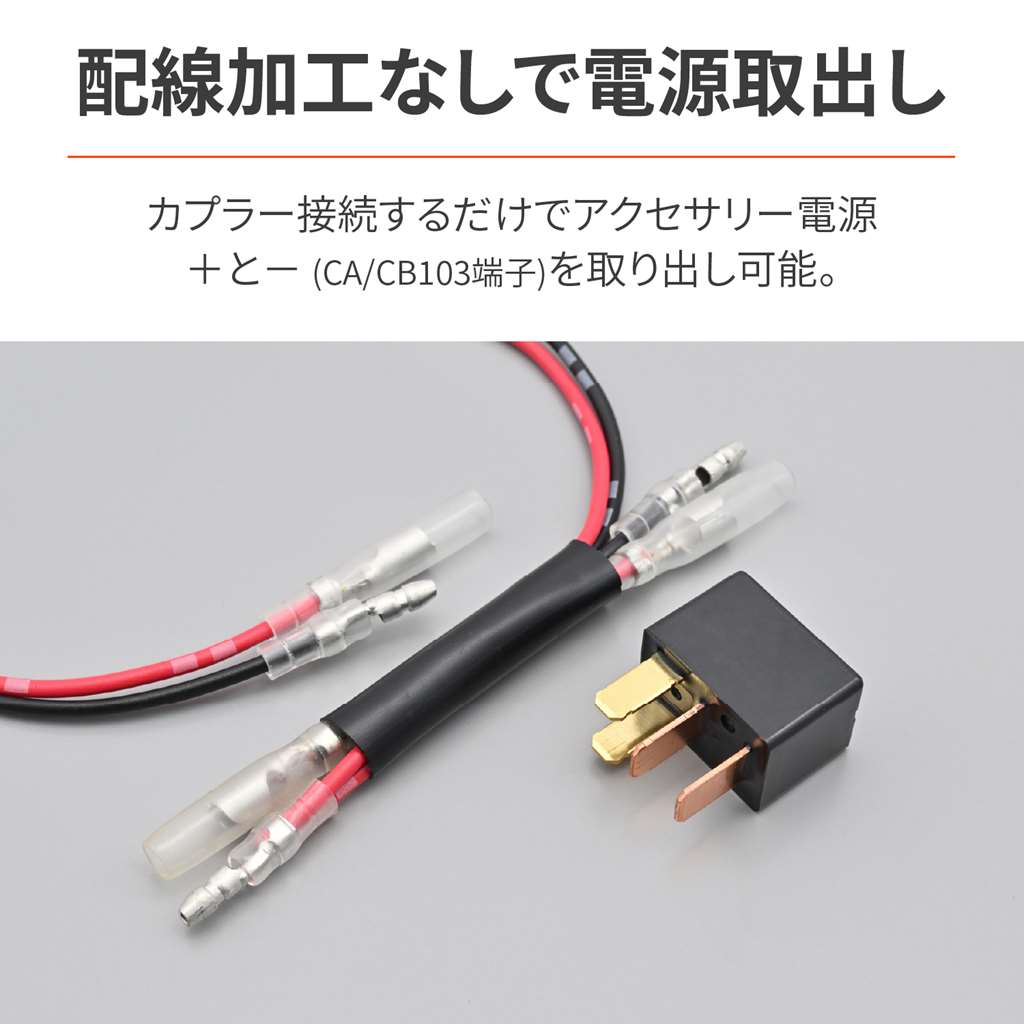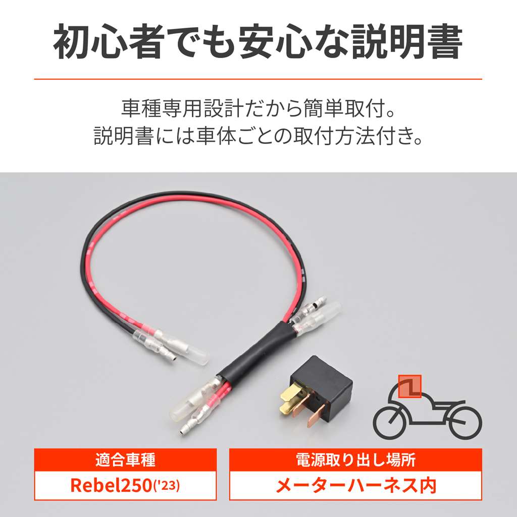 スマートフォンやナビなどの給電に便利なハーネス。車種専用設計だから、カプラーオンでACC電源が取り出し可能。面倒な配線加工をすることなく、カプラーを接続するだけで簡単に+と?の配線を取り出しできます。イグニッションキーのON/OFFに連動し、キーOFFで電源がカットされるので、バッテリー上がりの心配なし。説明書に車種ごとの取付方法付きで、初心者でも安心して取り付けできます。デイトナバイク専用電源シリーズのUSB電源ACC接続タイプに対応しています。適合車種:レブル250(23)カプラー接続だけでACC電源取り出しイグニッションキーに連動説明書に車種ごとの取付方法付きACC取り出し線接続部:CA/CB103 / 許容電力:12V/3A※バイク専用電源の種類によっては、接続部分をギボシに変更する必要があります。※装着する電装品のスペックを必ずご確認ください。※標準のギボシのタイプはCA/CB103タイプです。