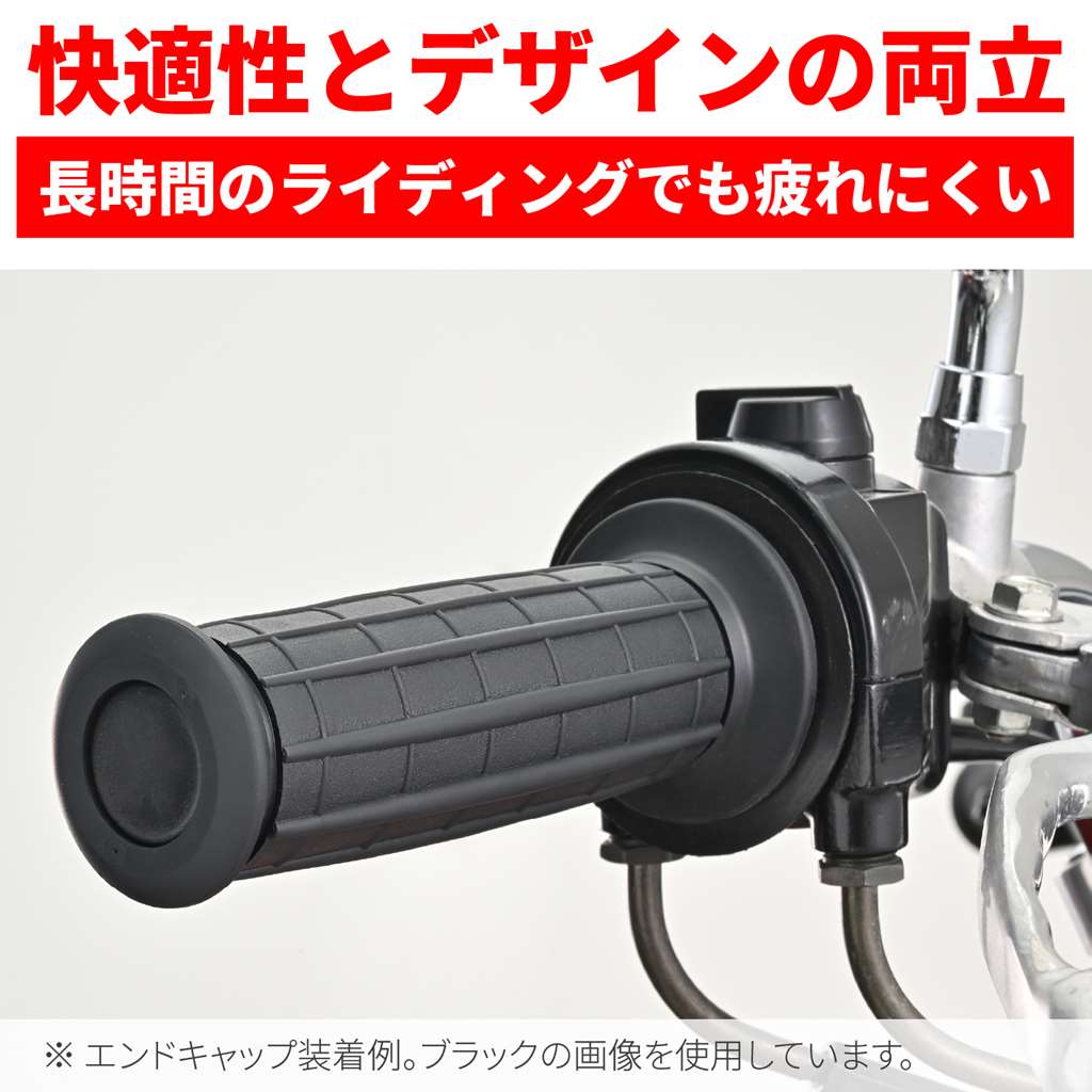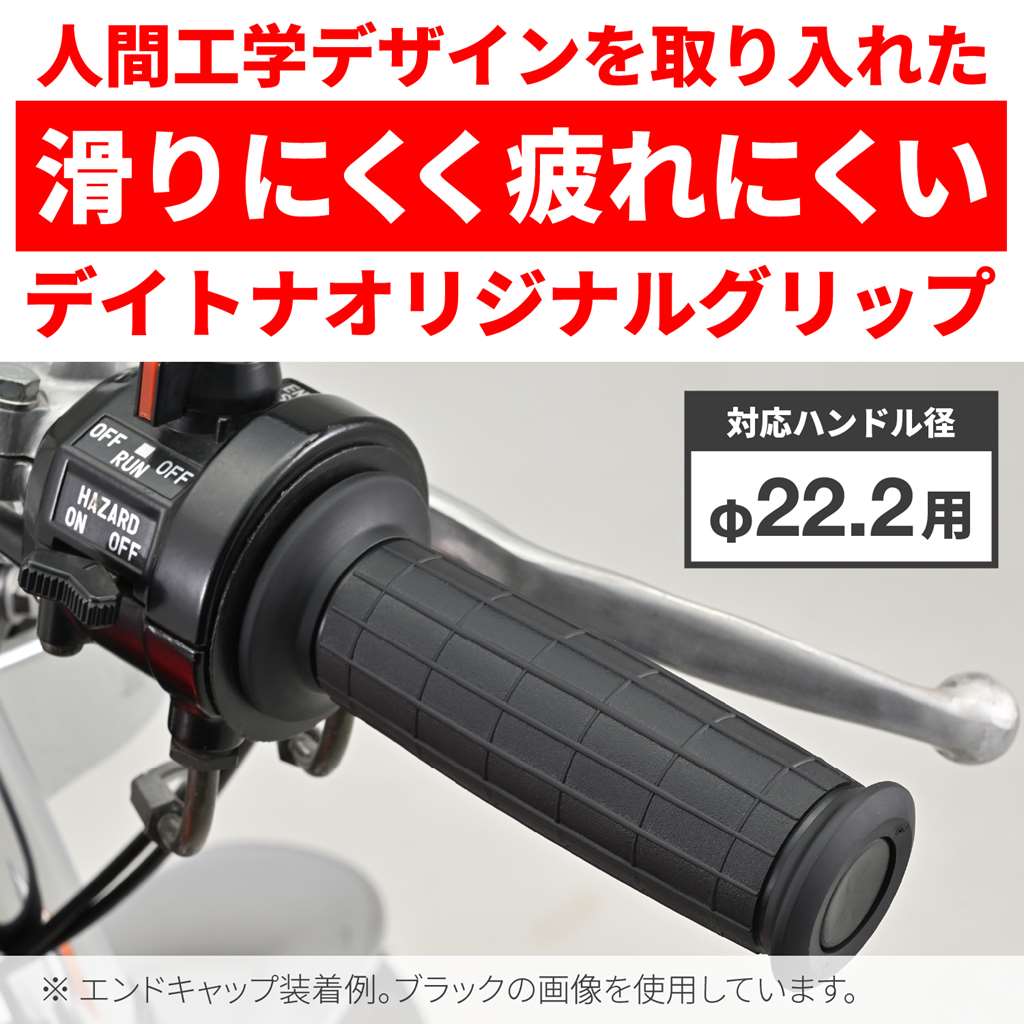 エルゴノミクス(人間工学)デザインを採り入れたデイトナのオリジナルグリップ。アクセルを握ったとき滑りにくい表面パターンと、グリップ力に優れる素材を組み合わせて、長時間のライディングでも疲れにくいグリップに仕上げました。ビンテージモーターサイクルグリップの雰囲気を出したタル型グリップ。指先にかかる部分のリブを高くすることで、スロットル操作をアシスト。エンド貫通でバーエンド装着にも対応。φ22.2mmハンドル用グリップグリップ長:122mmエンド貫通タイプ人間工学デザイン採用で、疲れにくくグリップ力に優れるビンテージ車両に似合うタル型のグリップ。高さ違いで配置したラインがスロットル操作をアシスト※確実に取り付けるため、グリップボンドを使用してください。セーフティワイヤーを併用するとより効果的です。(ワイヤーリング用溝加工済)※純正スロットルスリーブがリブ付きの構造の場合リブを削りとるか、スロットルスリーブをデイトナ社FLATスロットルスリーブに交換して取り付けてください。※1インチ(φ25.4)ハンドル車には取り付けできません。