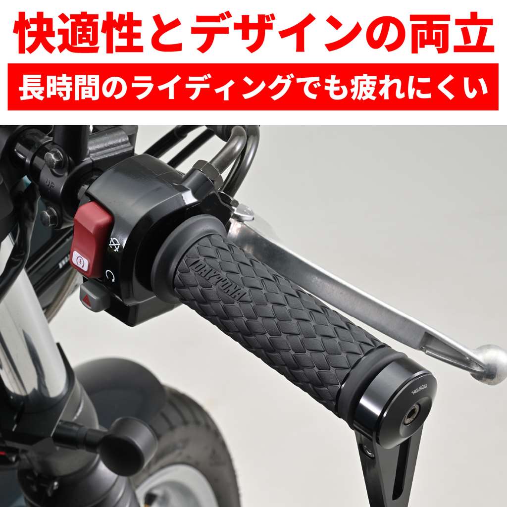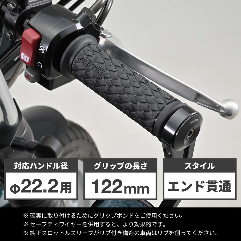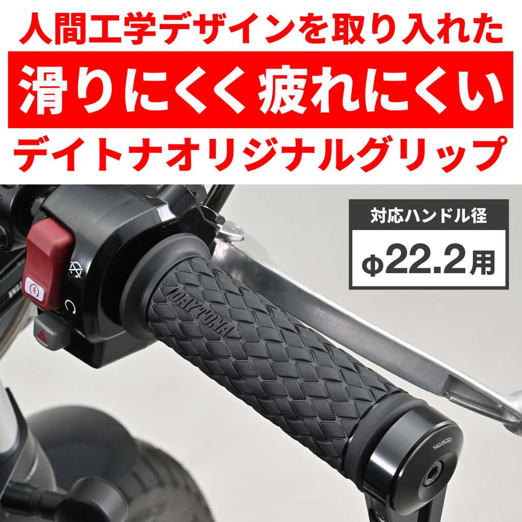 エルゴノミクス(人間工学)デザインを採り入れたデイトナのオリジナルグリップ。アクセルを握ったとき滑りにくい表面パターンと、グリップ力に優れる素材を組み合わせて、長時間のライディングでも疲れにくいグリップに仕上げました。ストリートカスタム定番のダイヤパターンを編み込みデザインで再現。エッジとアールで作られた凹凸はやわらかいイメージ。エンド貫通でバーエンド装着にも対応。φ22.2mmハンドル用グリップグリップ長:122mmエンド貫通タイプ人間工学デザイン採用で、疲れにくくグリップ力に優れるストリートカスタム定番のダイヤパターンを編み込みデザインで再現※確実に取り付けるため、グリップボンドを使用してください。セーフティワイヤーを併用するとより効果的です。(ワイヤーリング用溝加工済)※純正スロットルスリーブがリブ付きの構造の場合リブを削りとるか、スロットルスリーブをデイトナ社FLATスロットルスリーブに交換して取り付けてください。※1インチ(φ25.4)ハンドル車には取り付けできません。