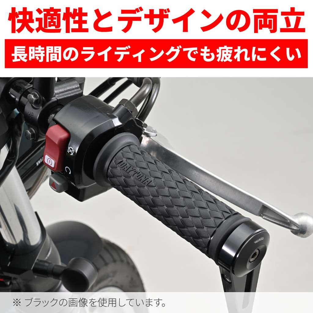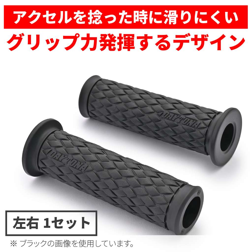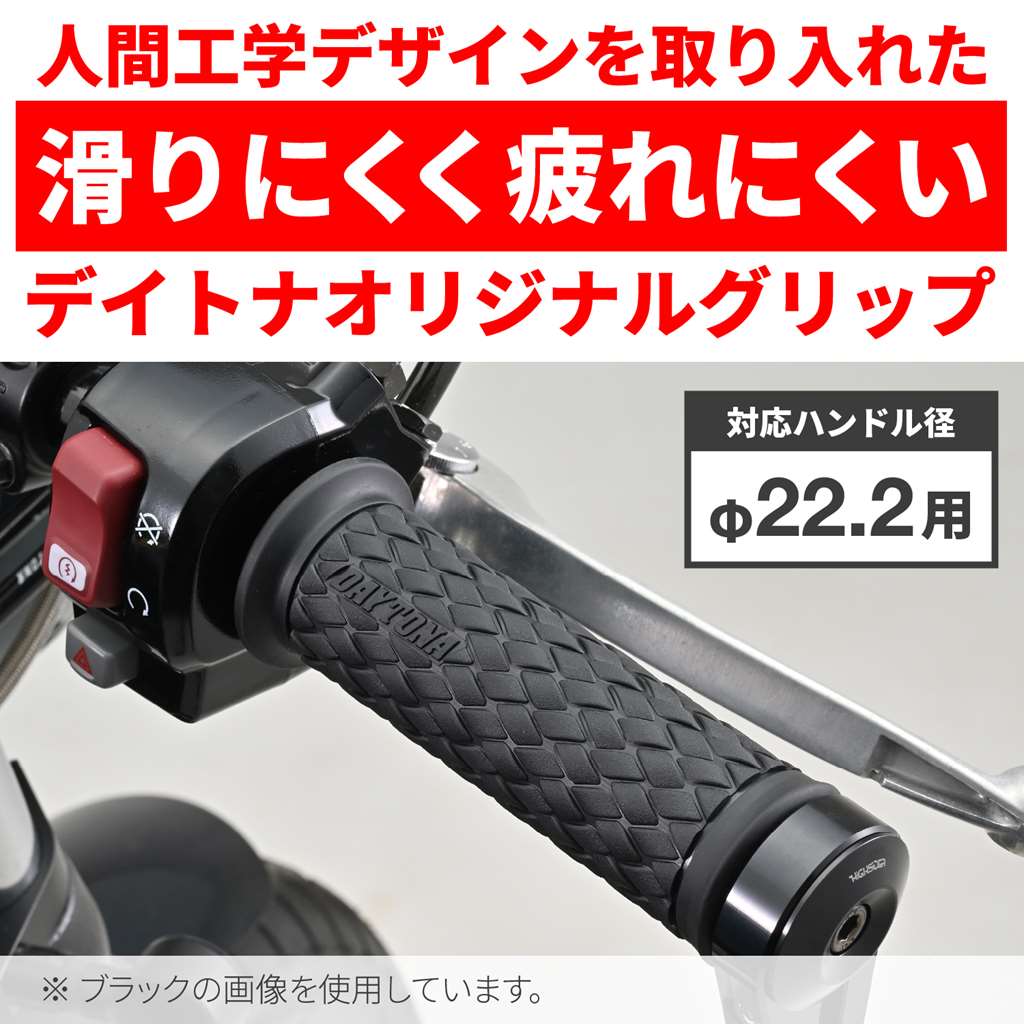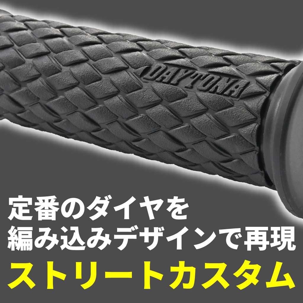エルゴノミクス(人間工学)デザインを採り入れたデイトナのオリジナルグリップ。アクセルを握ったとき滑りにくい表面パターンと、グリップ力に優れる素材を組み合わせて、長時間のライディングでも疲れにくいグリップに仕上げました。ストリートカスタム定番のダイヤパターンを編み込みデザインで再現。エッジとアールで作られた凹凸はやわらかいイメージ。エンド貫通でバーエンド装着にも対応。φ22.2mmハンドル用グリップグリップ長:122mmエンド貫通タイプ人間工学デザイン採用で、疲れにくくグリップ力に優れるストリートカスタム定番のダイヤパターンを編み込みデザインで再現※確実に取り付けるため、グリップボンドを使用してください。セーフティワイヤーを併用するとより効果的です。(ワイヤーリング用溝加工済)※純正スロットルスリーブがリブ付きの構造の場合リブを削りとるか、スロットルスリーブをデイトナ社FLATスロットルスリーブに交換して取り付けてください。※1インチ(φ25.4)ハンドル車には取り付けできません。