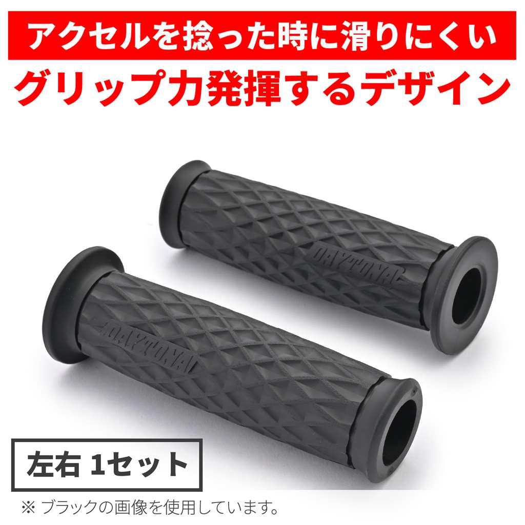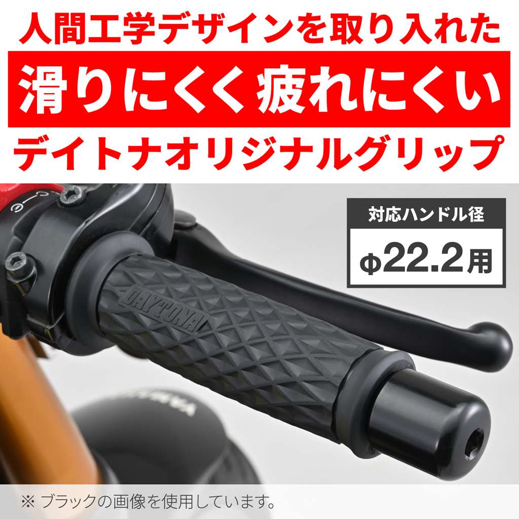 エルゴノミクス(人間工学)デザインを採り入れたデイトナのオリジナルグリップ。アクセルを握ったとき滑りにくい表面パターンと、グリップ力に優れる素材を組み合わせて、長時間のライディングでも疲れにくいグリップに仕上げました。ストリートカスタム定番のダイヤパターンをエアーインテークグリルデザインで再現。面を多用することで、立体感を強調。エンド貫通でバーエンド装着にも対応。φ22.2mmハンドル用グリップグリップ長:122mmエンド貫通タイプ人間工学デザイン採用で、疲れにくくグリップ力に優れるストリートカスタム定番のダイヤパターンをエアーインテークグリルデザインで再現※確実に取り付けるため、グリップボンドを使用してください。セーフティワイヤーを併用するとより効果的です。(ワイヤーリング用溝加工済)※純正スロットルスリーブがリブ付きの構造の場合リブを削りとるか、スロットルスリーブをデイトナ社FLATスロットルスリーブに交換して取り付けてください。※1インチ(φ25.4)ハンドル車には取り付けできません。