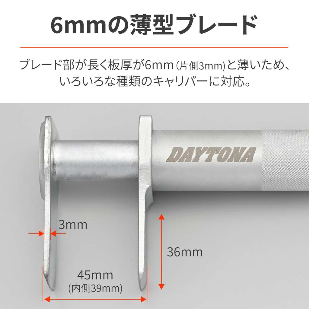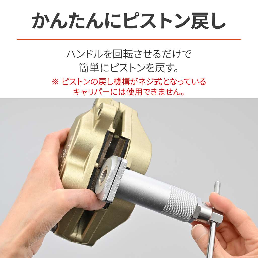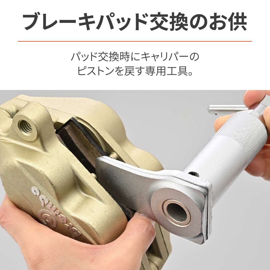 ブレーキパッド交換時にキャリパーピストンを押し戻すための専用工具。ハンドルを回転させるだけで簡単にピストンを戻すことができます。オートバイに最適な薄型のブレードを採用し、さらにブレードを長く伸ばしたことで様々な種類のキャリパーに対応。ハンドルの取り外しが可能なので、コンパクトに収納時可能。サイズ・ブレード板厚:6mm(片側3mm)・ブレード有効長:36mm・ブレード板幅:30mm・最大開き幅:45mm(内側:39mm)・重量:600g・ハンドル長:80mmブレーキパッド交換時にキャリパーピストンを押し戻すための専用工具ハンドルを回転させるだけで簡単にピストンを戻す薄型ブレード(厚み6mm)採用で、様々なキャリパーに対応ハンドルが取り外せることでコンパクト収納最大開き幅:45mm(内側:39mm)、ブレード板厚:6mm(片側3mm)、ブレード有効長:36mm、ブレード板幅:30mm※ピストンの戻し機構がネジ式となっているキャリパーには使用できません。