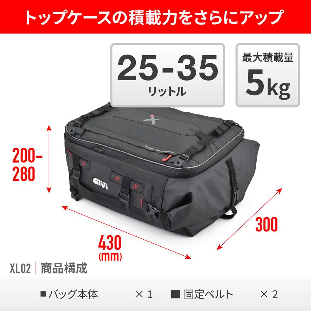 ハードケースの積載力をアップする防水ソフトバッグ。トップケース専用拡張バッグ。OUTBACKやALASKA、DOLOMITIシリーズのトップケースの上に装着することで積載量をアップできるソフトバッグです。接続部にはGIVI独自の「QUICKLOCK SYSTEM」を採用することで、しっかり固定でき脱着も簡単。ファスナーを開けて、容量が25Lから35Lへ拡張できます。脱着可能な防水インナーバッグを採用。二重構造で高い防水性(IPX5相当)を発揮。シートバックとしても使用可能です。商品構成:バッグ×1、固定ベルト×2適合トップケース・OUTBACK 58/42L・ALASKA 56/44L・DOLOMITI 46/30Lトップケースの上に装着することで積載量をアップできるソフトバッグ適合トップケース:OUTBACK 58/42L、ALASKA 56/44L、DOLOMITI 46/30L脱着可能な防水インナーバッグで防水性(IPX5相当)を発揮容量:25-35L / 最大積載重量:5kgサイズ(外側):約430×300×200-280(mm)