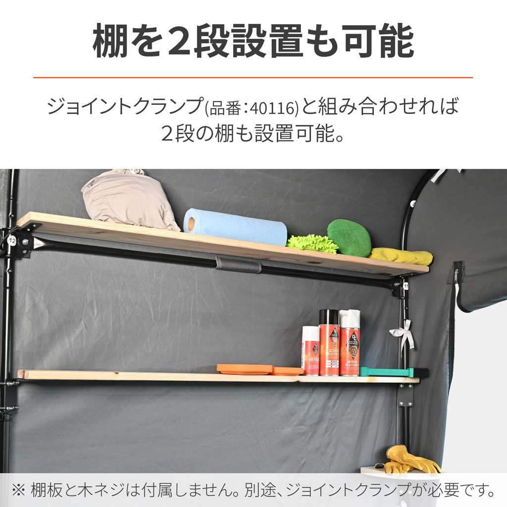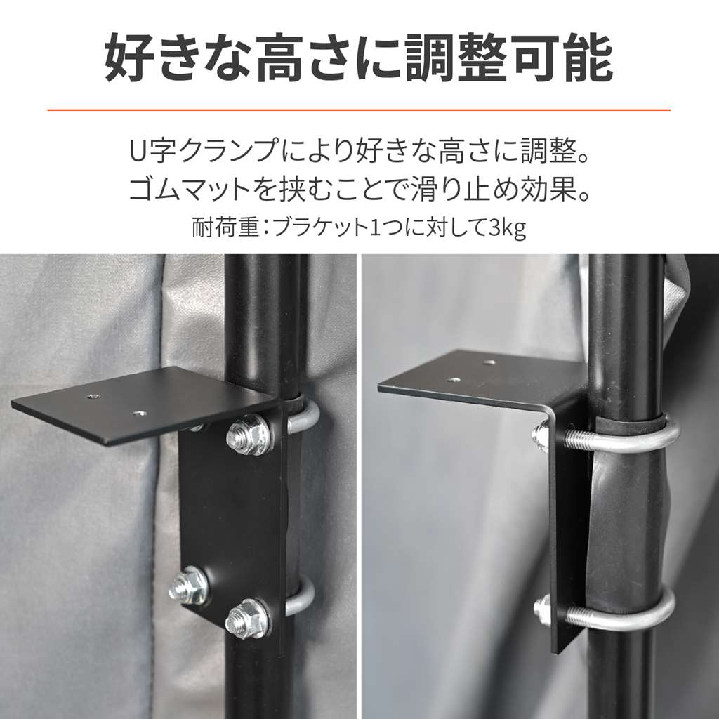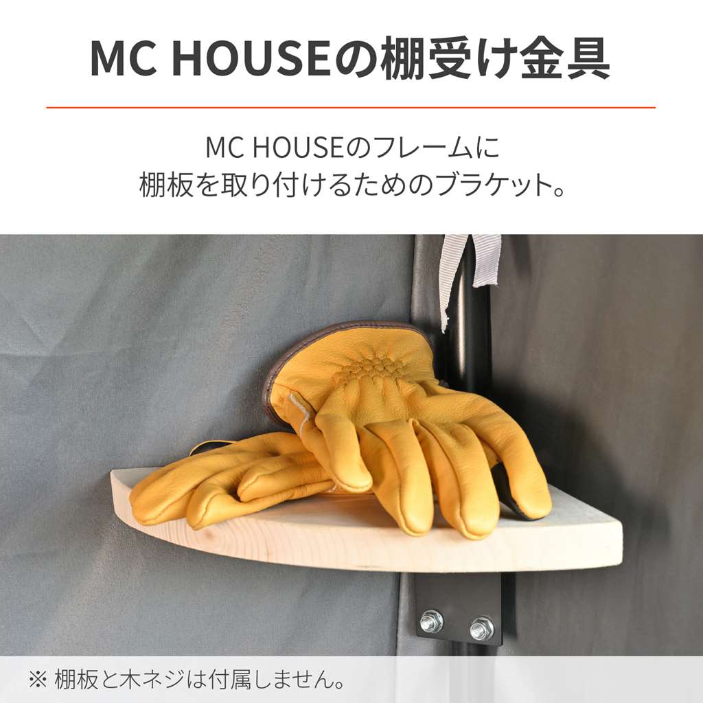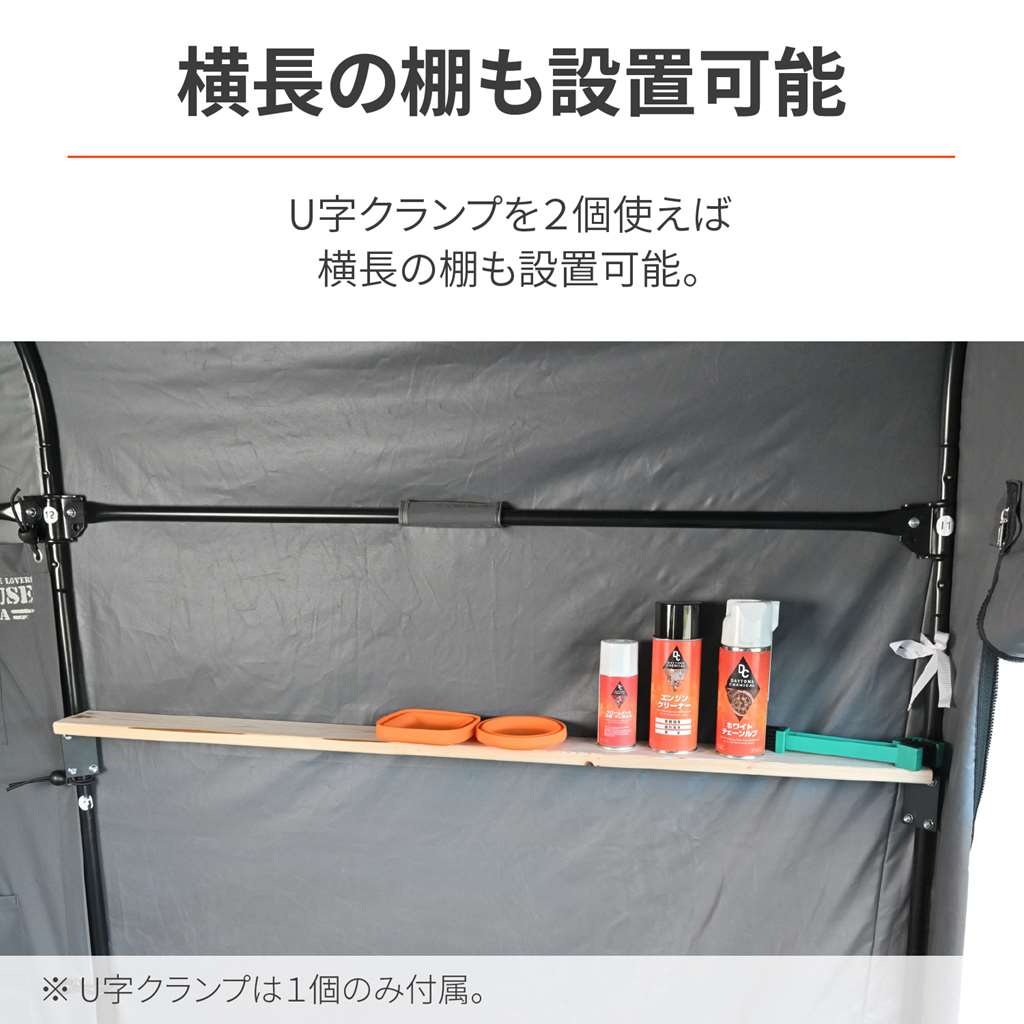 MCハウスのフレームに棚を取り付け、壁面のデッドスペースを有効活用できます。U字クランプでお好みの高さに棚が取り付けできる棚受け金具。耐荷重:ブラケット1つに対し3kg以内構成部品:棚板ブラケット、U字クランプ×2、ゴムマット、ナット×4ステー仕様:スチール製黒塗装MCハウス1000/1300/1700用 棚受け金具U字クランプでお好みの高さに取り付け可能耐荷重:ブラケット1つに対し3kg以内構成部品:棚板ブラケット、U字クランプ×2、ゴムマット、ナット×4 / ステー仕様:スチール製黒塗装MCハウスのサイズに合わせた棚板と木ネジは別途ご用意ください※棚板と木ネジは別途ご用意ください。※荷物を常時載せないでください。※横長の棚板を設置する場合は2個必要です。