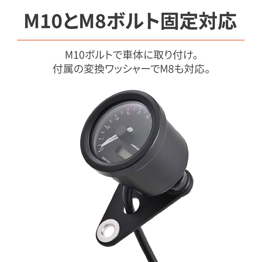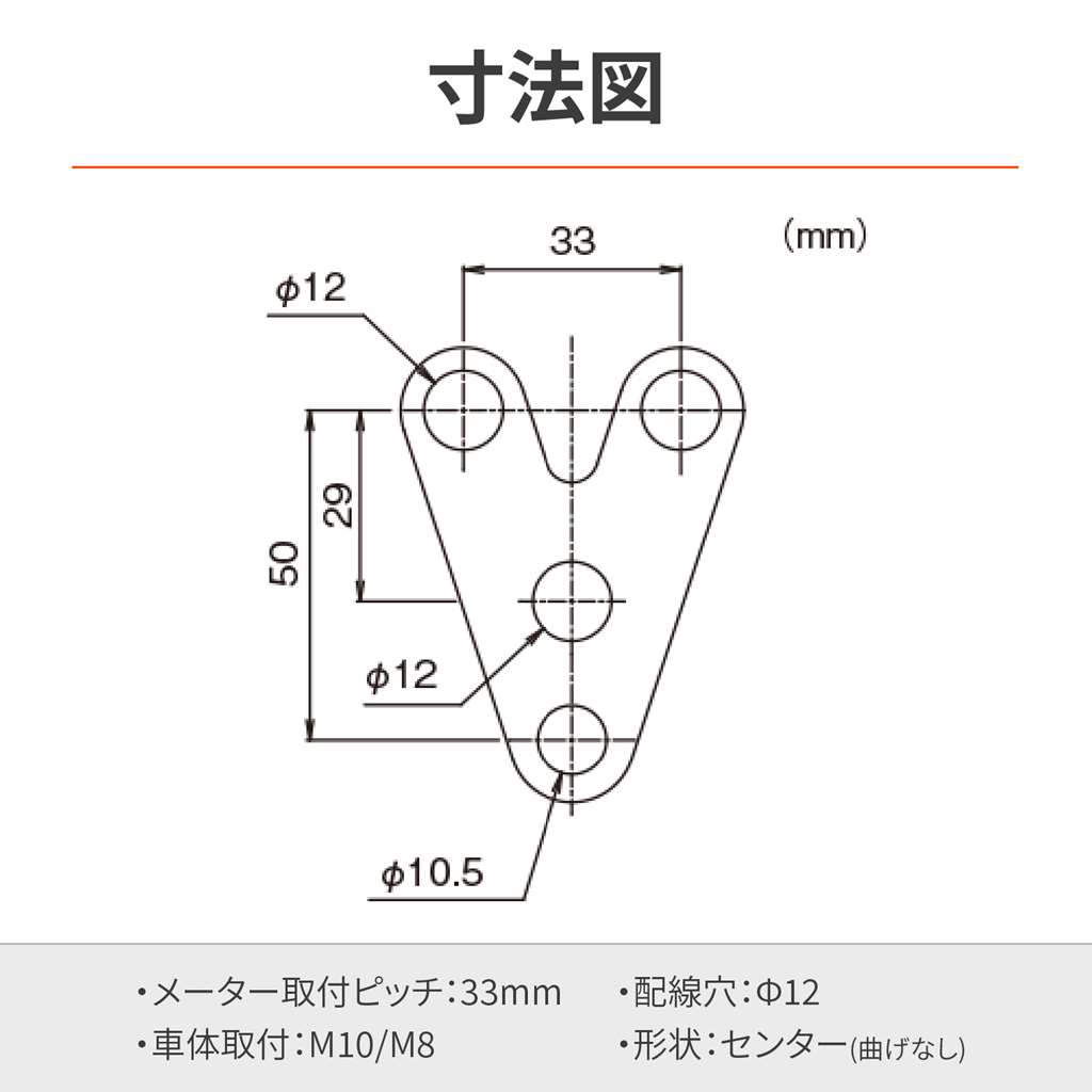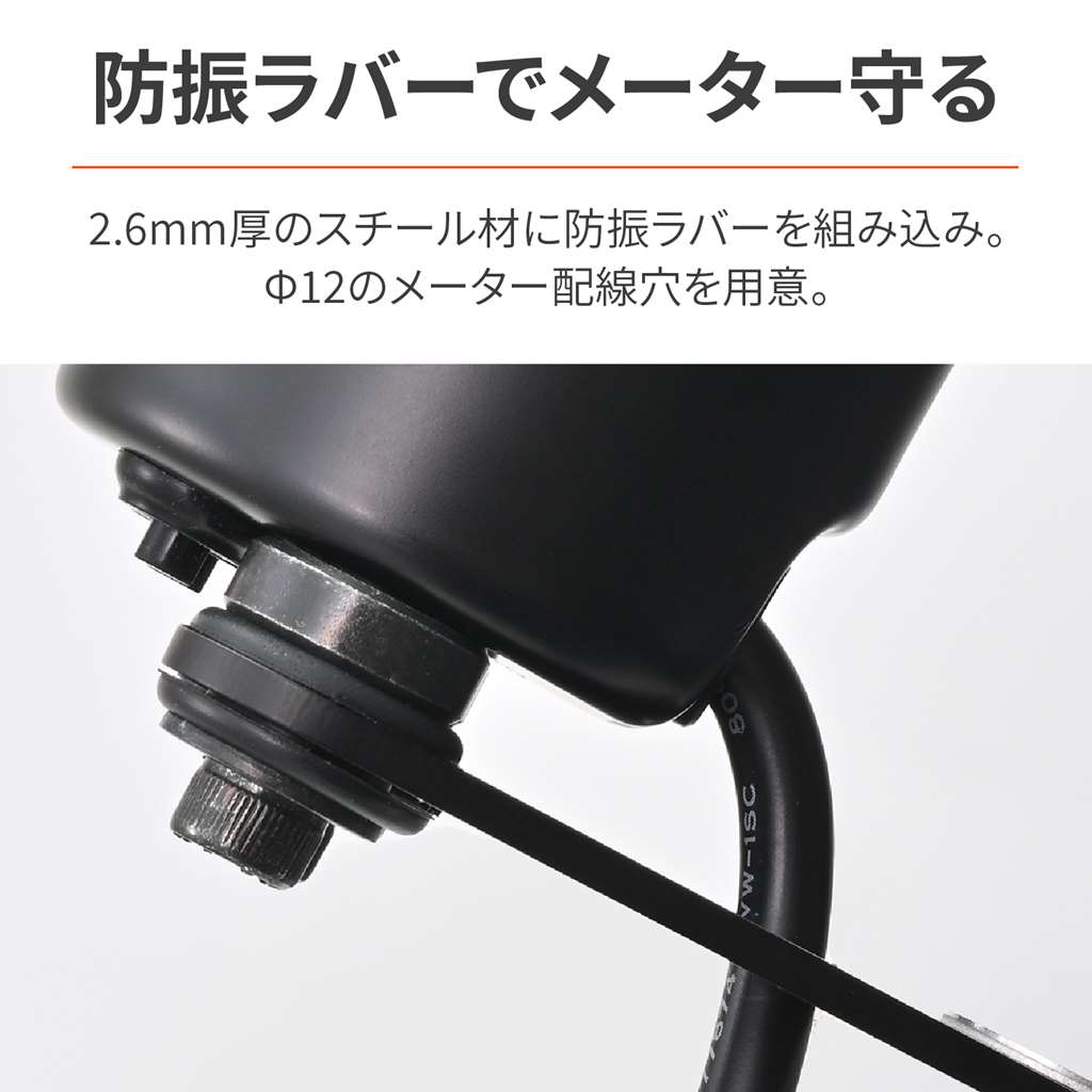 VELONAのφ48スピードメーターとタコメーター用のメーターステー。デリケートな電気式メーター取り付けに最適な防振タイプ。2.6mm厚のスチール材に防振ラバーを組み込みました。メーター取付ピッチ33mm。車体へはM10ボルト(付属なし)にて取り付けます。付属の変換ワッシャーを使用すればM8ボルトでも装着可能。ステー中央部にメーター配線を通す穴を設けたことで、スマートに取り付けできます。OPTIONフリーブラケット(品番:63531)と組み合わせれば、取付自由度がさらに広がります。材質・本体:スチール製マットブラック塗装・ワッシャー、ボルト、スペーサー:スチール製黒亜鉛メッキ・M8変換ワッシャー:アルミ構成部品・本体×1、ワッシャー×2、ボルト×2、カラー×2、ラバー×2、M8変換ワッシャー×1VELONAのφ48スピードメーターとタコメーター用のメーターステーメーターへの振動負荷を軽減できる防振ラバー付きメーター取付ピッチ33mm / 車体への取付M10、M8ボルトオプションフリーブラケット(品番:63531)と組み合わせで取付自由度アップセンター/曲げ無し※汎用品につき、メーター取付ピッチ、メーター底面形状(特に配線取出口)を必ずご確認のうえ、対応する商品をお選びください。※メーター底面にビスの頭がある場合は、完全にフラットの状態では取り付けることができません。必要に応じてカラーやワッシャーなどをご用意いただき、調整してください。※ラバーマウント方式のため、ご使用環境によってはメーターの揺れが大きくなることがあります。※φ80とφ60のVELONAメーターは使用できません。