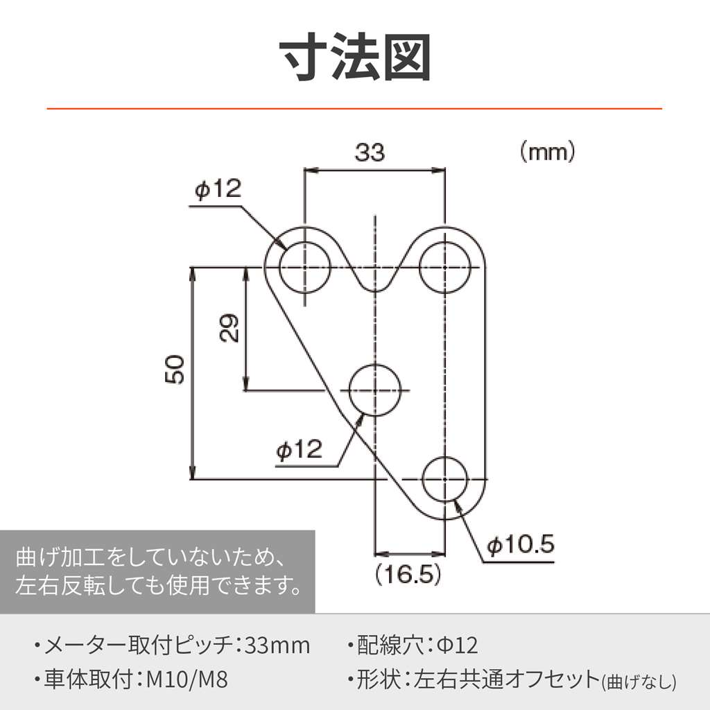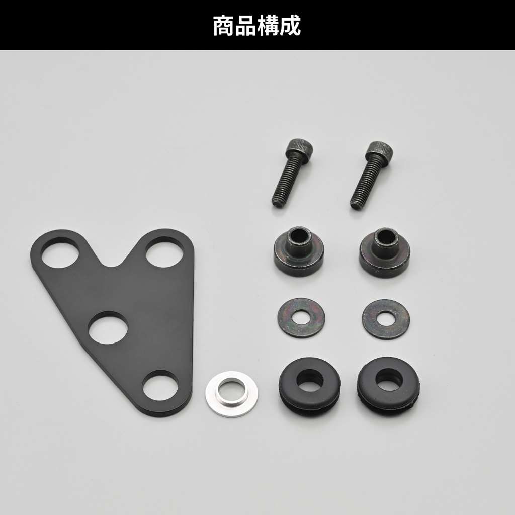 VELONAのφ48スピードメーターとタコメーター用のメーターステー。デリケートな電気式メーター取り付けに最適な防振タイプ。2.6mm厚のスチール材に防振ラバーを組み込みました。メーター取付ピッチ33mm。車体へはM10ボルト(付属なし)にて取り付けます。付属の変換ワッシャーを使用すればM8ボルトでも装着可能。ステー中央部にメーター配線を通す穴を設けたことで、スマートに取り付けできます。OPTIONフリーブラケット(品番:63531)と組み合わせれば、取付自由度がさらに広がります。材質・本体:スチール製マットブラック塗装・ワッシャー、ボルト、スペーサー:スチール製黒亜鉛メッキ・M8変換ワッシャー:アルミ構成部品・本体×1、ワッシャー×2、ボルト×2、カラー×2、ラバー×2、M8変換ワッシャー×1VELONAのφ48スピードメーターとタコメーター用のメーターステーメーターへの振動負荷を軽減できる防振ラバー付きメーター取付ピッチ33mm / 車体への取付M10、M8ボルトオプションフリーブラケット(品番:63531)と組み合わせで取付自由度アップ左右共通オフセット/曲げ無し※汎用品につき、メーター取付ピッチ、メーター底面形状(特に配線取出口)を必ずご確認のうえ、対応する商品をお選びください。※メーター底面にビスの頭がある場合は、完全にフラットの状態では取り付けることができません。必要に応じてカラーやワッシャーなどをご用意いただき、調整してください。※ラバーマウント方式のため、ご使用環境によってはメーターの揺れが大きくなることがあります。※φ80とφ60のVELONAメーターは使用できません。