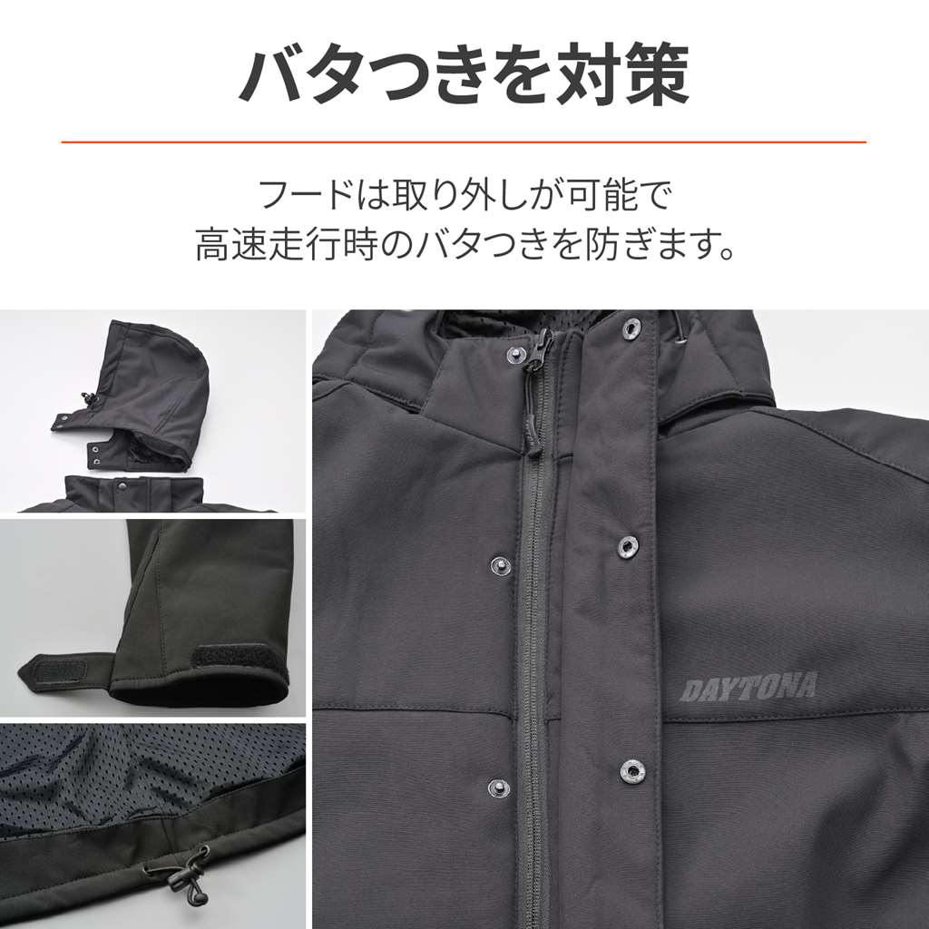 フードは脱着が可能で、高速走行時のバタつきを防ぎます。