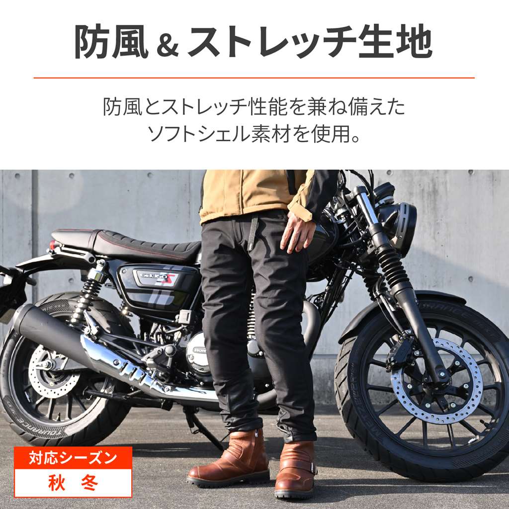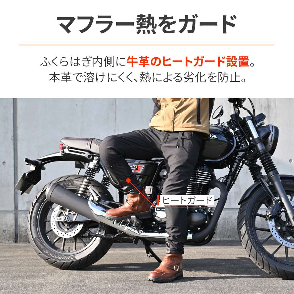 高い防風とストレッチ性を兼ね備えたソフトシェル素材を使用。ふくらはぎの内側に牛革のヒートガード設置。本革で溶けにくく熱による劣化を防止します。裏地は肌触りが良いフリースを採用。インナー不要の直履きパンツに仕上げました。股下に三角形の拡張を設けることで、開脚時の突っ張りを軽減。バイクに跨りやすい設計になっています。ひざプロテクター標準装備。別売のSAS-TECへアップグレードが可能です。シーズン:秋冬防風+ストレッチ性のあるソフトシェル素材ふくらはぎ内側に牛革のヒートガードを装備裏地は肌触りの良い暖かいフリース。直接履ける直履きパンツ開脚時の突っ張りを軽減するために股下に三角形の拡張を設置※ウエスト、ヒップは商品寸法ではありません。弊社独自の計測方法に基づく、寸法となります。※股下は製品寸法です。※実際の製品は個体差が生じる場合がございます。サイズは目安としてご参考ください。