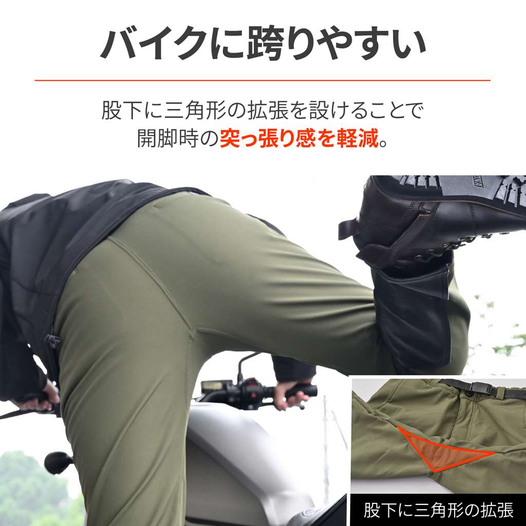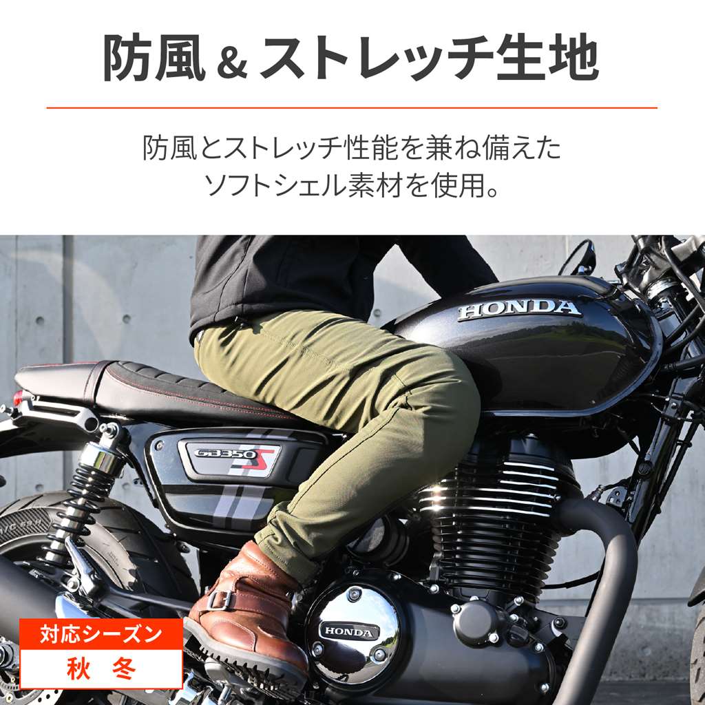 高い防風とストレッチ性を兼ね備えたソフトシェル素材を使用。ふくらはぎの内側に牛革のヒートガード設置。本革で溶けにくく熱による劣化を防止します。裏地は肌触りが良いフリースを採用。インナー不要の直履きパンツに仕上げました。股下に三角形の拡張を設けることで、開脚時の突っ張りを軽減。バイクに跨りやすい設計になっています。ひざプロテクター標準装備。別売のSAS-TECへアップグレードが可能です。シーズン:秋冬防風+ストレッチ性のあるソフトシェル素材ふくらはぎ内側に牛革のヒートガードを装備裏地は肌触りの良い暖かいフリース。直接履ける直履きパンツ開脚時の突っ張りを軽減するために股下に三角形の拡張を設置※ウエスト、ヒップは商品寸法ではありません。弊社独自の計測方法に基づく、寸法となります。※股下は製品寸法です。※実際の製品は個体差が生じる場合がございます。サイズは目安としてご参考ください。