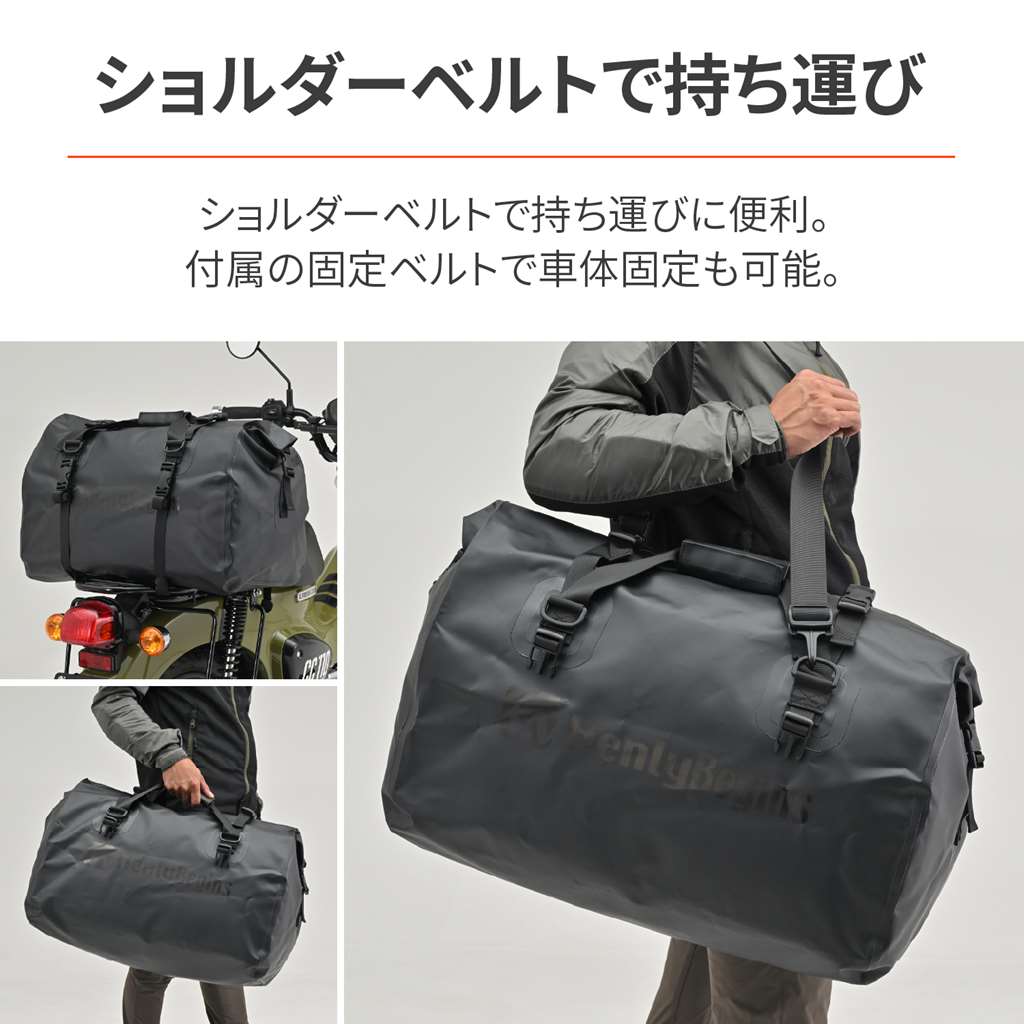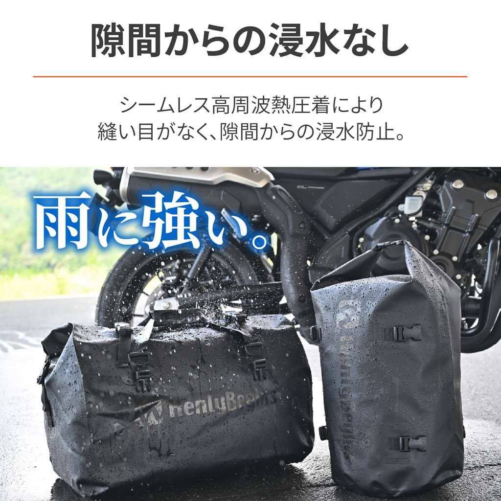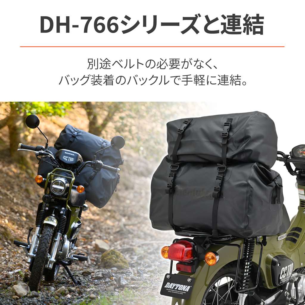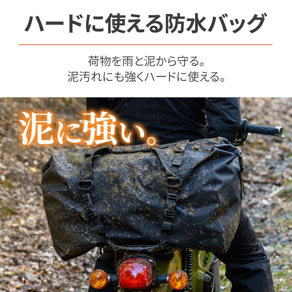 雨、泥を気にせずアクティブにバイクに乗りたい、そんなライダーのための防水シートバッグ。ターポリン生地と縫い目のないシームレスで高い防水性を実現し、水だけでなく泥跳ねからも荷物を守ります。水が浸入しないように出し入れ口はロールトップを採用。付属の固定ベルトで、車体装着が可能。防水バックパック(DH-748、DH-766シリーズ)と連結が可能で、更に用途が広がります。容量:60Lサイズ:高さ350×幅550×奥行330mm本体重量(付属品込):1.2kg最大積載量:14kg素材:ターポリン素材付属品:固定ベルト×4、ショルダーベルト×1高い防水性のある生地とシームレス加工により、水だけでなく泥跳ねからも荷物を守る防水シートバッグ容量:60L / サイズ:高さ350×幅550×奥行330mm / 本体重量(付属品込):1.2kg付属の固定ベルトで車両に固定可能防水シートバッグ(DH-749、DH-767シリーズ)と連結が可能付属品:固定ベルト×4、ショルダーベルト×1