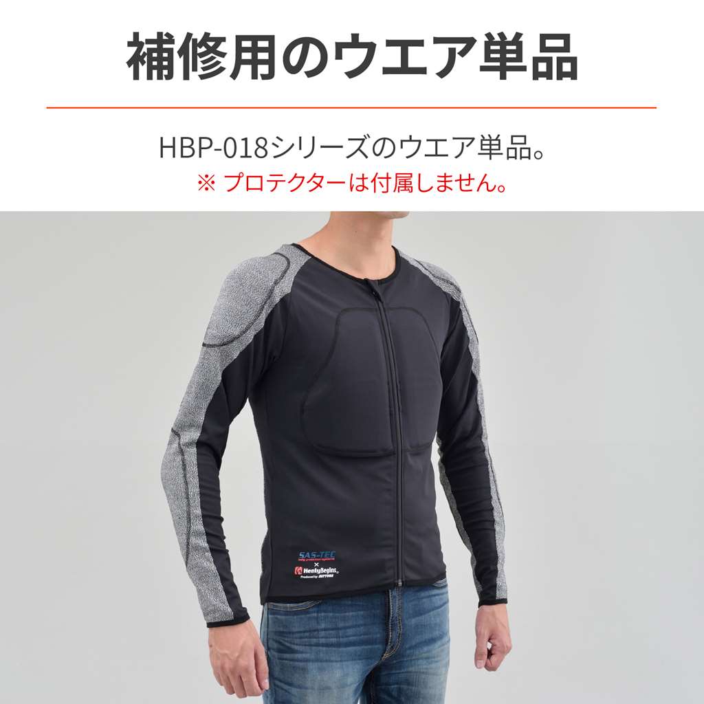 インナープロテクター HBP-018シリーズの補修ウエア。ウエア補修用、洗濯時の替え用の一着としてご使用ください。サイズが合えばお手持ちのプロテクターを挿入してインナーとして着用いただけます。摩耗に強い特殊生地「HPPEマテリアル」を腕と背中に、その他の部位にはストレッチ生地を採用。【HPPEマテリアル】耐切創繊維(切れにくい機能性繊維)として、機械的防護手袋の要求性能試験「EN 388:2016」の回転刃試験にてレベル4を取得した生地と同等の生地を採用。【適合ウエア】耐切創インナープロテクター HBP-018シリーズ名:HBP-018 補修ウエア耐切創+ストレッチタイプウエア補修用、着替え用の一着に※プロテクターは付属しません。※本製品はモーターサイクルライディングウェアとしての快適性および安全性を重視して開発されておりますが、転倒時など外部からの衝撃に対して、身体を完全に保護できるものではありません。ライディング時は常に安全運転をお願いいたします。※ご自身の体にフィットするものをお選びください。サイズが合っていないウェアを着用されますと、プロテクション効果が充分に発揮されない場合やライディングに支障をきたす場合もあり非常に危険です。