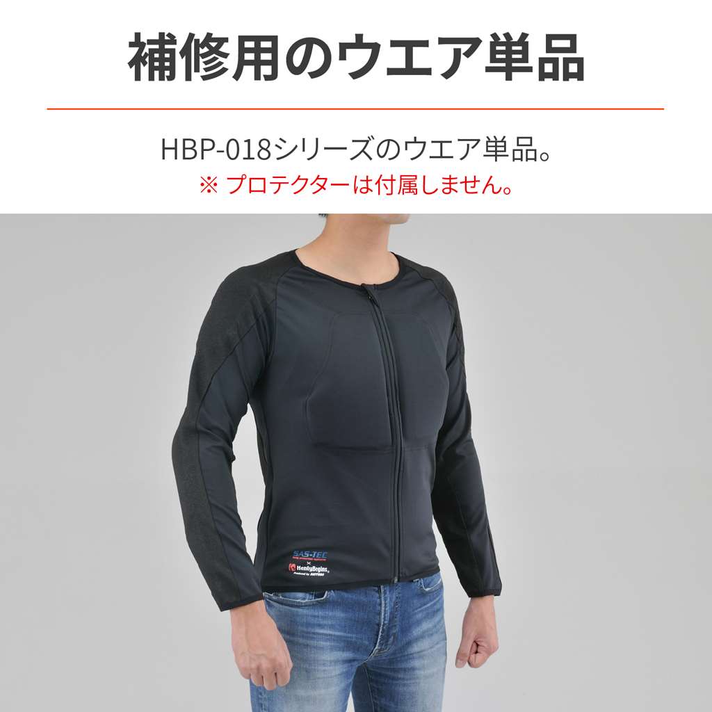 インナープロテクター HBP-018シリーズの補修ウエア。ウエア補修用、洗濯時の替え用の一着としてご使用ください。サイズが合えばお手持ちのプロテクターを挿入してインナーとして着用いただけます。摩耗に強い特殊生地「HPPEマテリアル」を腕と背中に、その他の部位にはストレッチ生地を採用。【HPPEマテリアル】耐切創繊維(切れにくい機能性繊維)として、機械的防護手袋の要求性能試験「EN 388:2016」の回転刃試験にてレベル4を取得した生地と同等の生地を採用。【適合ウエア】耐切創インナープロテクター HBP-018シリーズ名:HBP-018 補修ウエア耐切創+ストレッチタイプウエア補修用、着替え用の一着に※プロテクターは付属しません。※本製品はモーターサイクルライディングウェアとしての快適性および安全性を重視して開発されておりますが、転倒時など外部からの衝撃に対して、身体を完全に保護できるものではありません。ライディング時は常に安全運転をお願いいたします。※ご自身の体にフィットするものをお選びください。サイズが合っていないウェアを着用されますと、プロテクション効果が充分に発揮されない場合やライディングに支障をきたす場合もあり非常に危険です。
