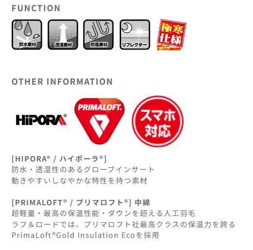 甲側には高い防風性を持つウインドガード生地を採用することで、冷たい外気をシャットアウト。動きやすいフローティングナックルパッドと各指のレザーフィンガーカバーは、プロテクション性と同時に防風性を高次元で両立。さらに手首内側にはフェイクボア、グローブ内部には、高機能中綿の最高峰素材、プリマロフト(R)を採用。軽く撥水性の高い中綿で極寒の中でのライディングが快適になります。手のひら側は耐久性、プロテクション性の高い牛革を使用。冬でも積極的に走るヘビーツアラーに贈る、高性能マルチパーパスウインターグローブに仕上げました。MATERIAL:甲側/牛革、ウインドガードファブリック、反射素材、ナックルパッド中綿/プリマロフト(R) 掌側/牛革、スマートタッチレザーインナー/HIPORA(R)グローブインサート裏地/フリース、フェイクボアFUNCTION: 両手人差し指・親指タッチパネル対応