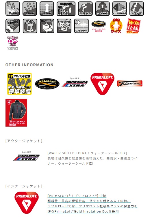 厳冬の季節、防寒性能を極めることにフォーカスしたスペシャルウォームジャケット。脱着可能なファー付きフードとアウターネックウォーマーが、襟首周りから寒風の侵入を許さず、裾からの侵入はストームガードでシャットアウトし体熱を逃しません。インナージャケットの裏地はチタンをスパッタリング加工し、体熱を効果的に反射し高効率で身体を保温。さらに、中綿には超軽量・イージーメンテナンス性を兼ね備えた最高クラスの保温力を誇るPrimaLoft(R)Gold Insulation Eco(プリマロフト(R)・ゴールド・インサレーション・エコ)を採用し究極の防寒性を誇ります。プリマロフト(R)は、羽毛に代わる画期的な超微細マイクロファイバー素材で羽毛のように軽くて暖かい保温性と柔軟性を発揮するだけではなく、羽毛にはない撥水性を備えており水にも強い機能性(メンテナンス性・断熱性・防寒テクノロジー)と、過酷な環境でも使える高い実用性を備えた先進の人工羽毛です。最高の機能と最高の素材を惜しみなく投入した究極(ポーラー)ジャケットは冬でしか味わえない景色を求める、元気なライダーをどこまでもサポート。防寒・防水・防風・保温することを高次元で両立させたスペシャルウインタージャケットです。MATERIAL: 表地/ポリエステルヘリンボーン、フェイクファー、防風ストレッチ素材裏地/ウォーターシールドEXインナー/エンボスタフタ、チタン起毛トリコットインナー中綿/ポリエステル(プリマロフト(R))PROTECTOR: 胸・肩・肘・脊椎パッド 標準装備INNER: プリマロフト(R)インナージャケット 標準装備