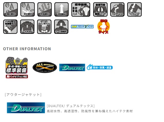 防水・防風・透湿性を兼ね備える高性能素材デュアルテックスと強力な撥水加工を施し湿気を逃がす透湿性があるため、衣服内を常にドライに保ちます。