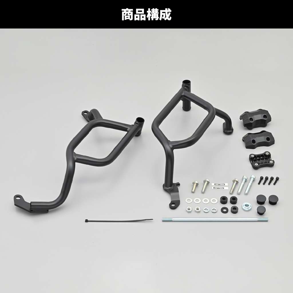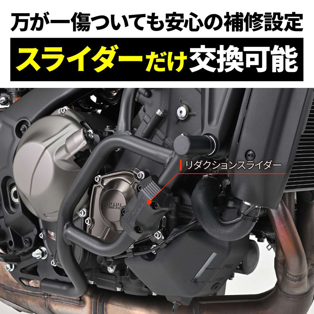 迫力あるフレームワークのパイプエンジンガード。転倒時の車両のダメージを軽減。アドベンチャースタイルを強調するパイプレイアウト。車体の全体のイメージを損なわないコンパクト設計。不必要に目立たないマットブラック塗装済み。メインパイプはφ25.4パイプで軽度な転倒時にクランクケース周りを保護し、エンジンへのダメージを最小限にします。MADE IN JAPAN。【適合車種】XSR900(22) 【8BL- RN80J】、MT-09(21-22) 【8BL-RN69J】※MT-09(14-20) 【1RC8/B878】適合不可・左右セット・リダクションスライダー付属軽度な転倒時にクランクケース周りを保護し、エンジンへのダメージを最小限に大きく外側へ張り出さない仕様で、装着してもスタイリッシュで目立ちにくいデザイン全体のイメージを損なわないコンパクト設計リダクションスライダー付属※本商品はマットブラック塗装のため、飛び石やバイク保管用保護カバーとのすれ等で塗装がはがれる場合があります。